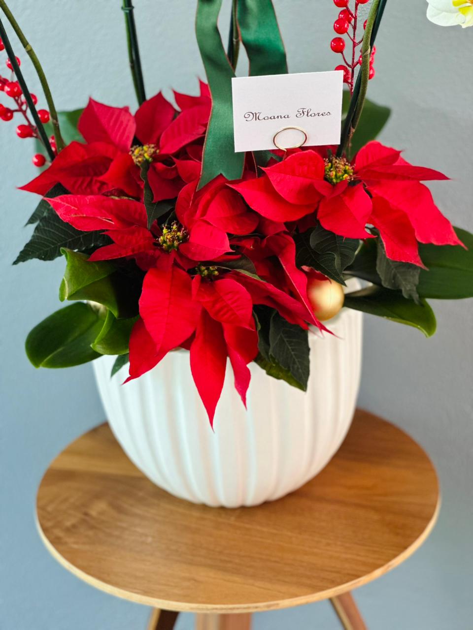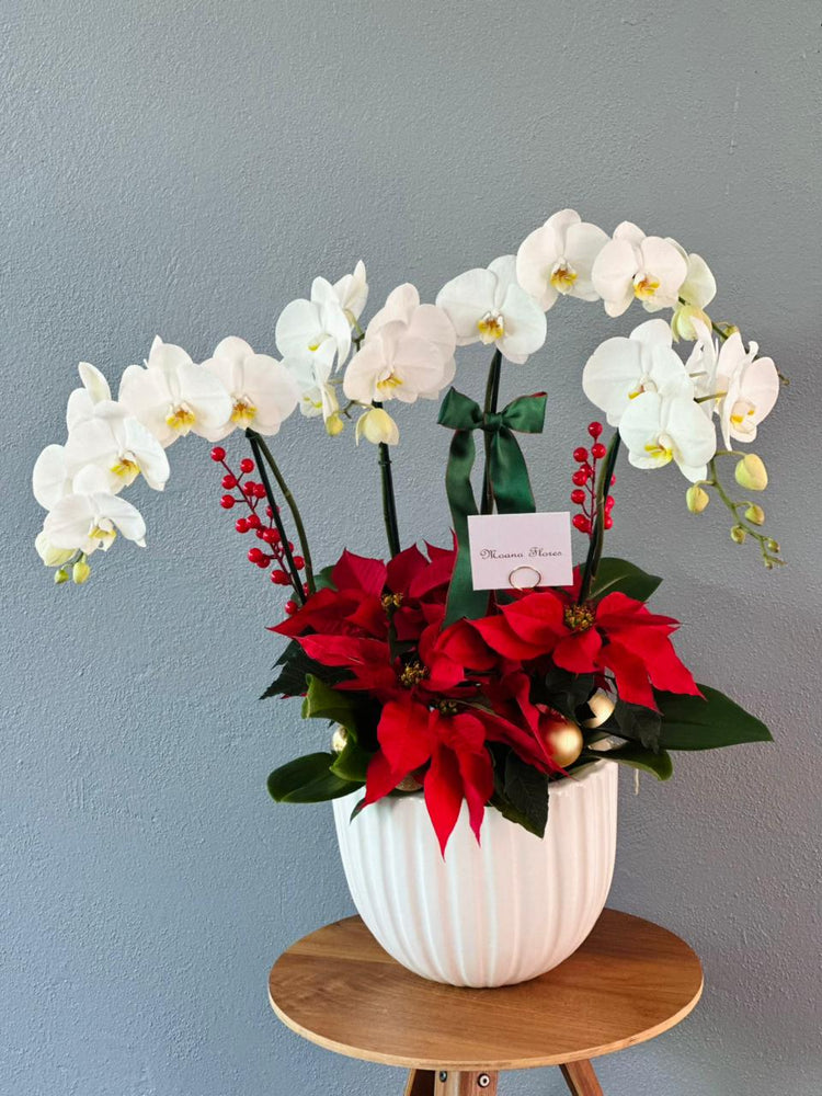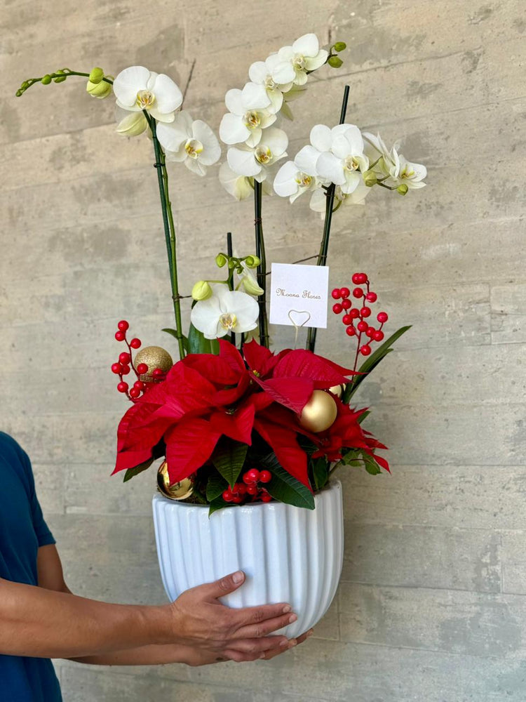 Nuestro arreglo de temporada “Canela y Mantequilla” es un modelo creado para destacar en cualquier espacio. Sus orquídeas blancas en planta aportan una presencia serena y sofisticada, mientras que las esferas navideñas añaden un brillo cálido que evoca la temporada. Las pascuas rojas, vibrantes y llenas de carácter, equilibran la composición con un toque tradicional y festivo. Todo está reunido en una maceta elegante que realza cada elemento, dando como resultado una pieza envolvente, refinada y perfecta para acompañar los momentos más especiales de estas fechas.