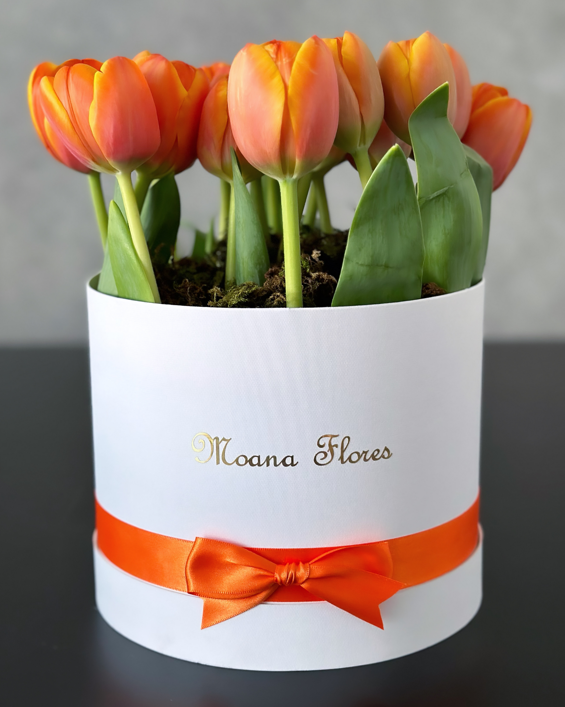 Este vibrante arreglo presenta tulipanes naranjas frescos, cuidadosamente dispuestos en una caja circular alta blanca adornada con un listón naranja. Perfecto para transmitir energía y alegría, este detalle floral aporta un toque cálido y sofisticado, ideal para sorprender en cualquier ocasión especial.