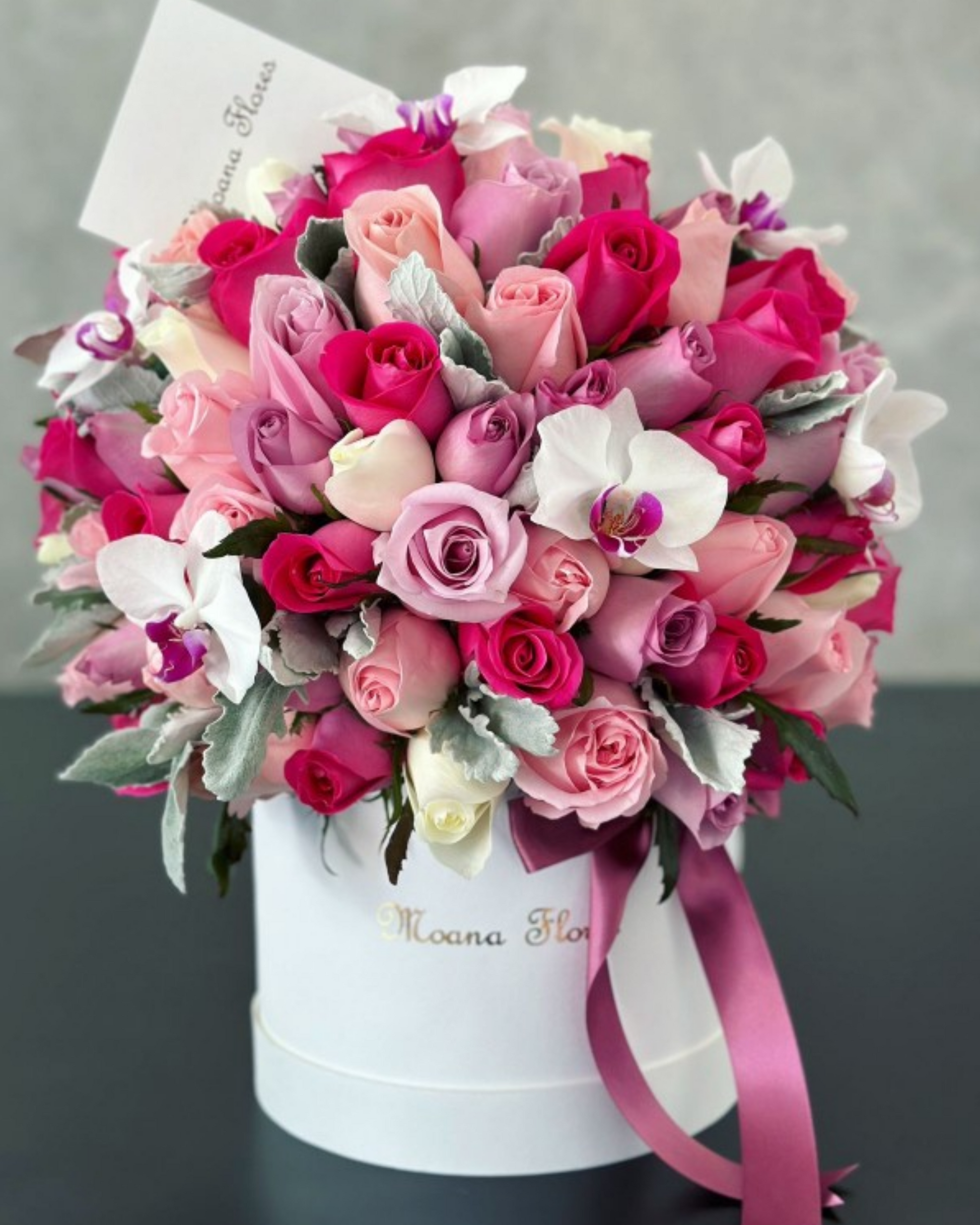 Este elegante ramo en forma de domo combina rosas caricia, moradas, fucsia, blancas y náutica, acompañado de miller. Presentado en una alta caja circular blanca con listón, este arreglo destaca por su armonía de colores y su presentación sofisticada. Perfecto para sorprender y expresar sentimientos con un detalle vibrante y lleno de vida que cautiva a primera vista. Regala elegancia y emoción en un solo regalo.