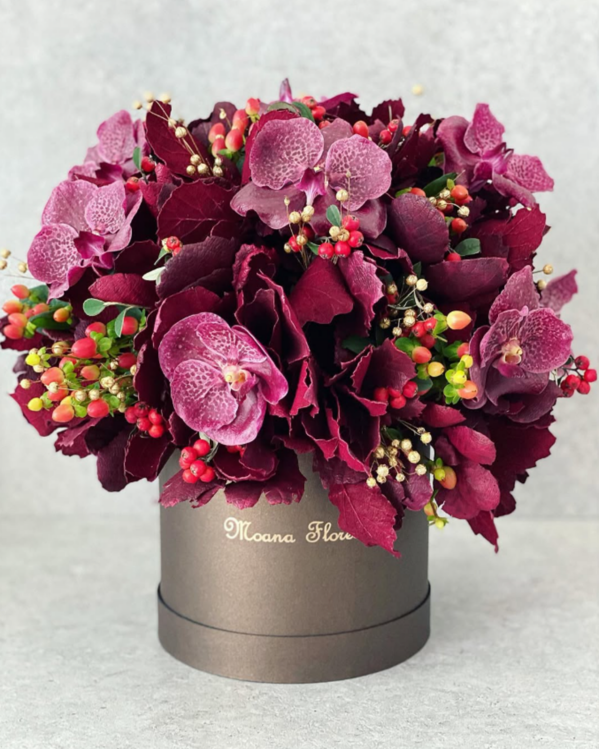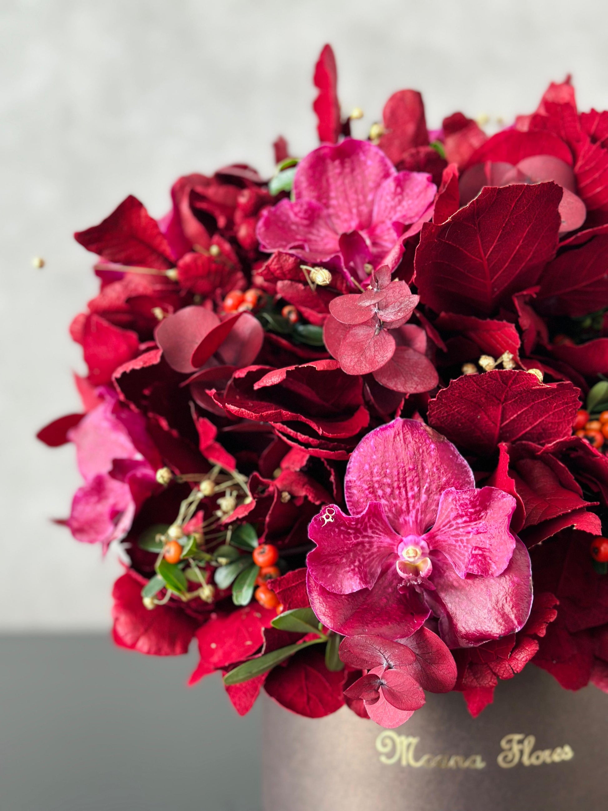 Este elegante arreglo en forma de domo combina follaje seco en tonos rojos con sutiles toques verdes, presentado en una caja circular alta marrón. Perfecto para aportar calidez y sofisticación, este detalle natural es ideal para sorprender y decorar con estilo en cualquier ocasión especial.