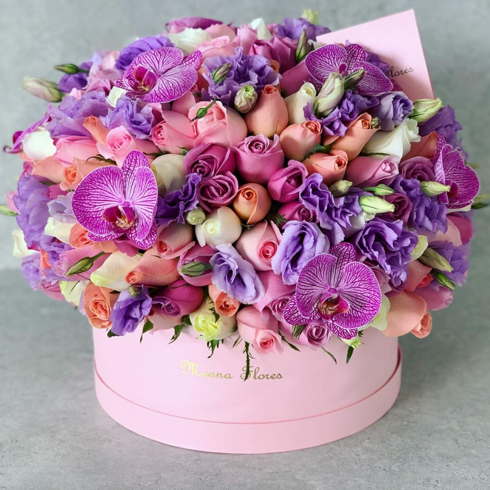 Este sofisticado arreglo en forma de domo combina rosas moradas, caricia, blancas, hermosas, náutica, lisianthus lila y orquídeas rayadas moradas, presentado en una elegante caja circular rosa. Perfecto para transmitir delicadeza y estilo, este detalle floral aporta un toque armonioso y refinado, ideal para sorprender en cualquier ocasión especial.