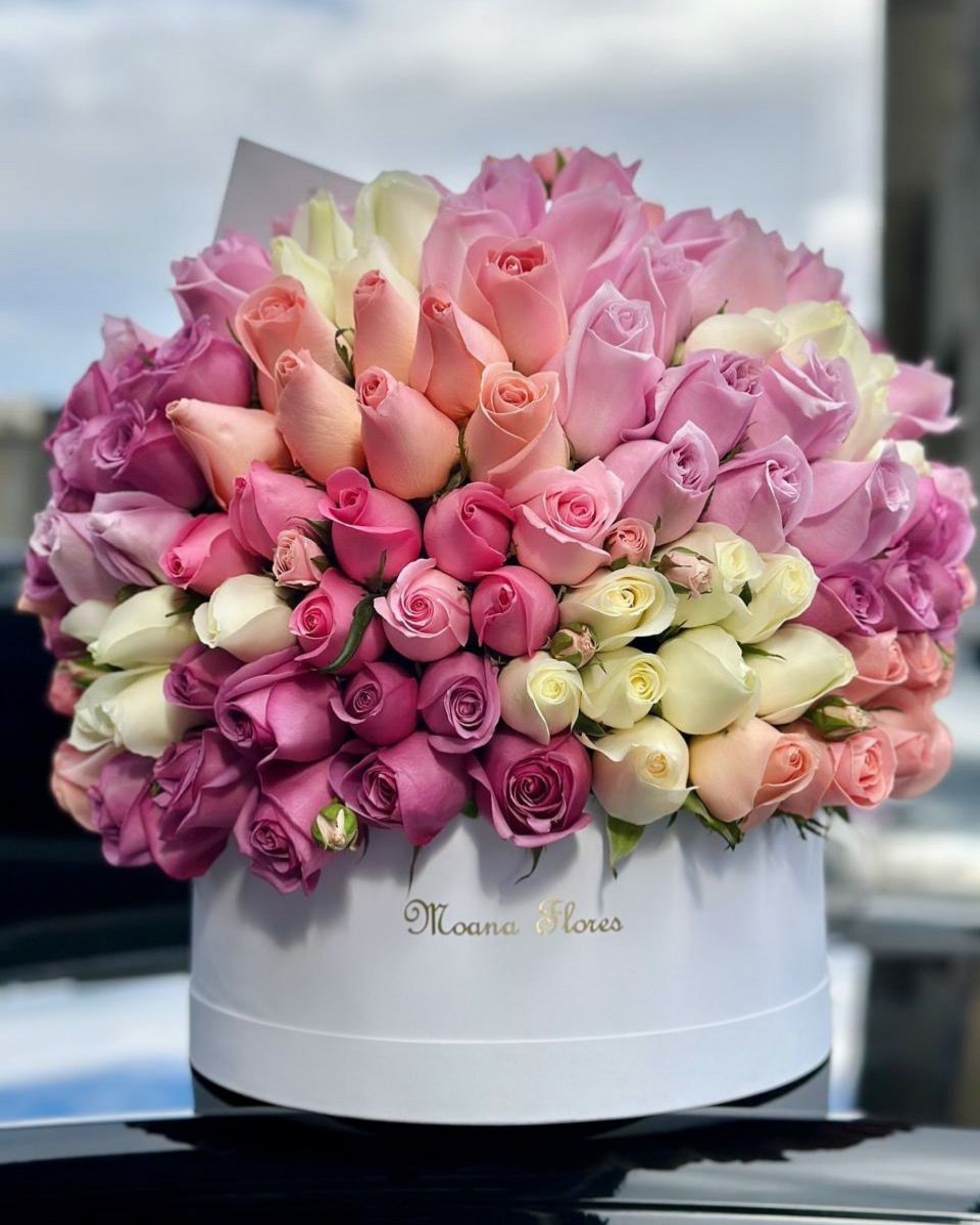 Este atrevido arreglo en forma de domo combina rosas moradas, náuticas, señoritas, hermosas, caricias, rosa mini y miller, presentado en una caja circular blanca. Con una mezcla audaz de colores y texturas, este detalle floral es perfecto para quienes buscan destacar y sorprender con estilo único en cualquier ocasión especial.