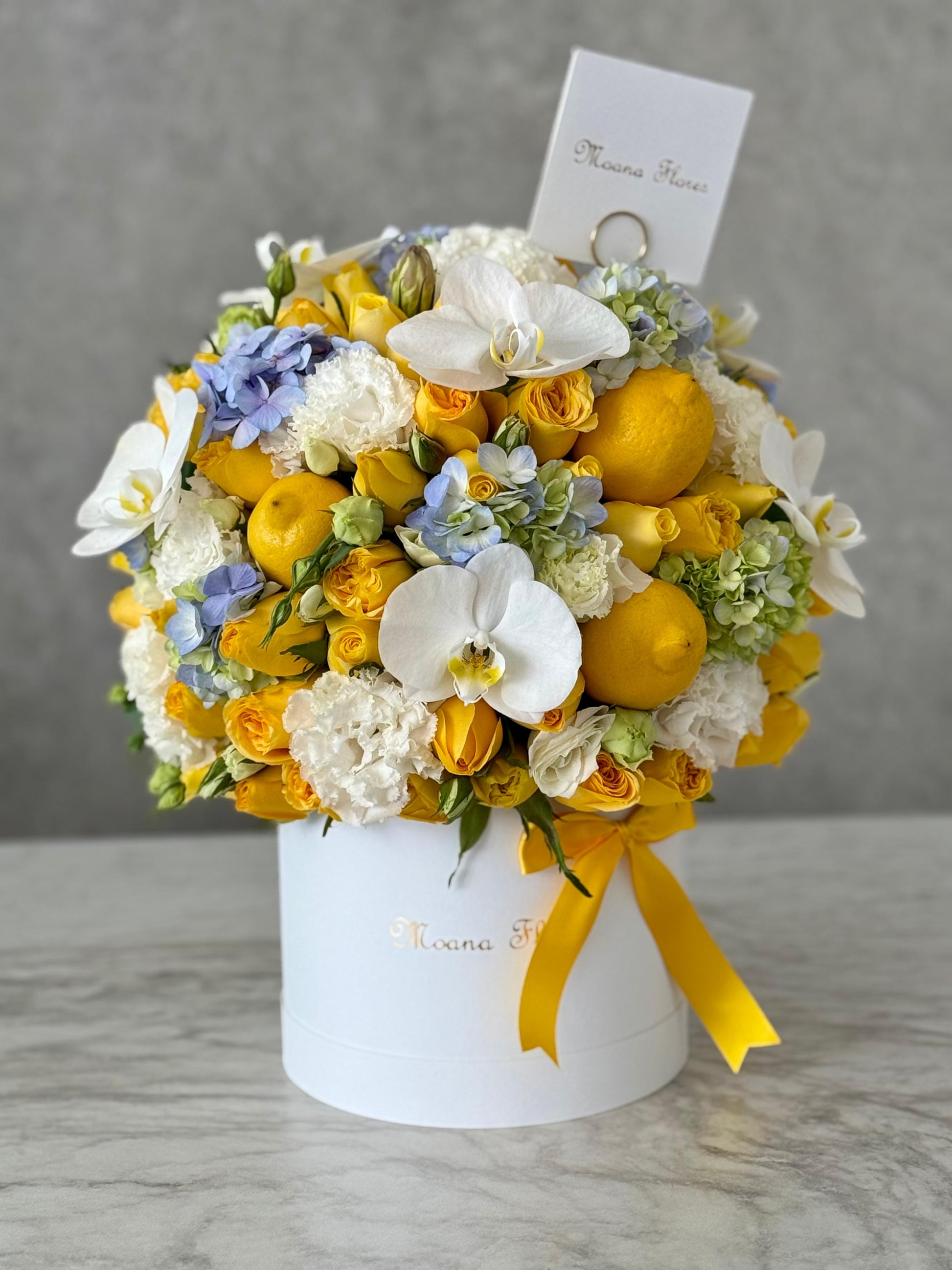 Este sofisticado arreglo combina rosas amarillas, hortensia azul, lisianthus blanco, limones Eureka, craspedias y mini rosas blancas, creando una composición fresca y elegante. Perfecto para aportar un toque de distinción y vitalidad, este detalle floral realza cualquier espacio con estilo y sofisticación.