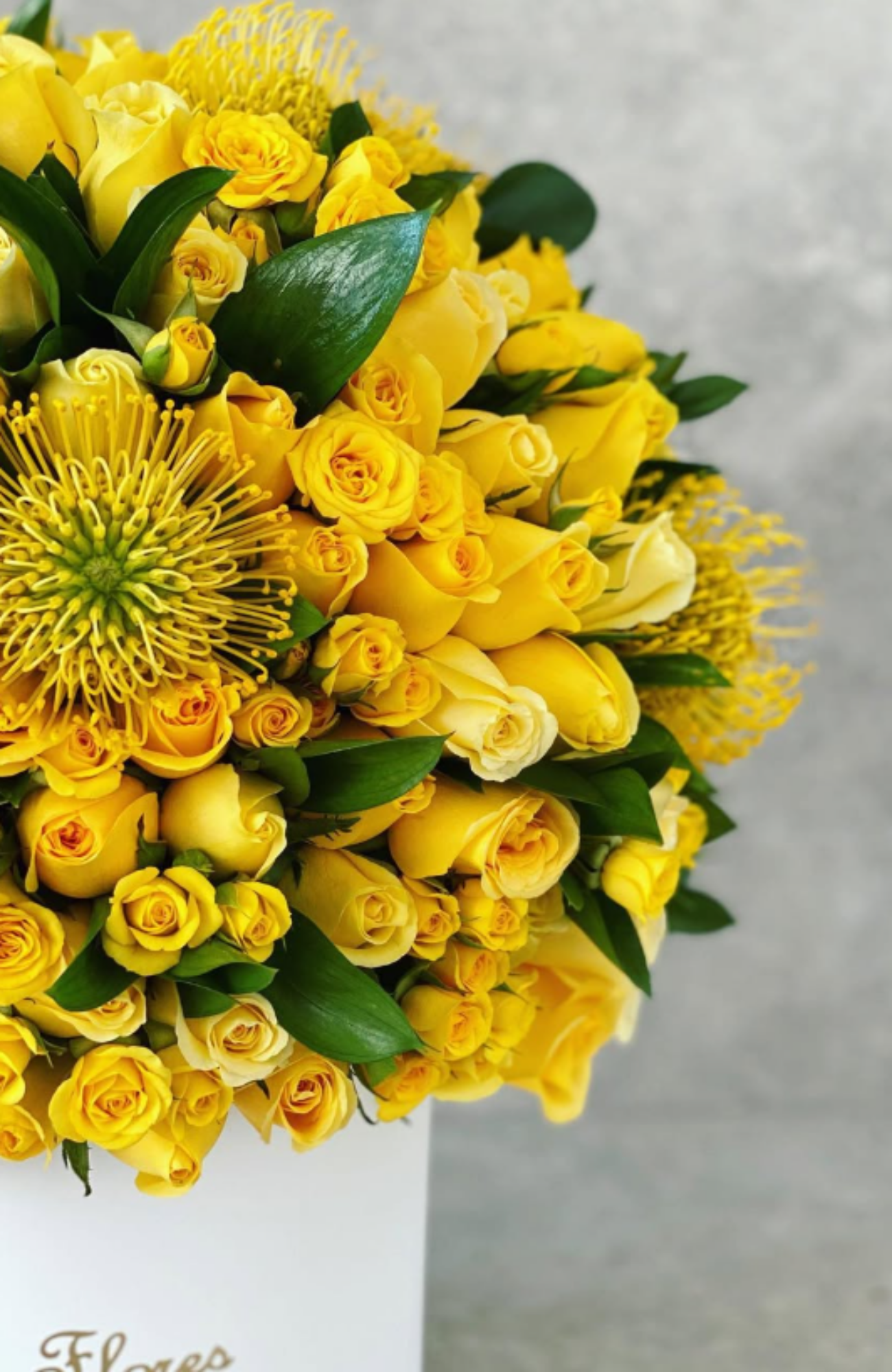 Este hermoso arreglo en forma de domo combina rosas amarillas, follaje fresco y leucos amarillos, presentado en una elegante caja circular alta blanca. Ideal para transmitir alegría y vitalidad, este detalle floral aporta un toque sofisticado y lleno de frescura, perfecto para sorprender en cualquier ocasión especial.