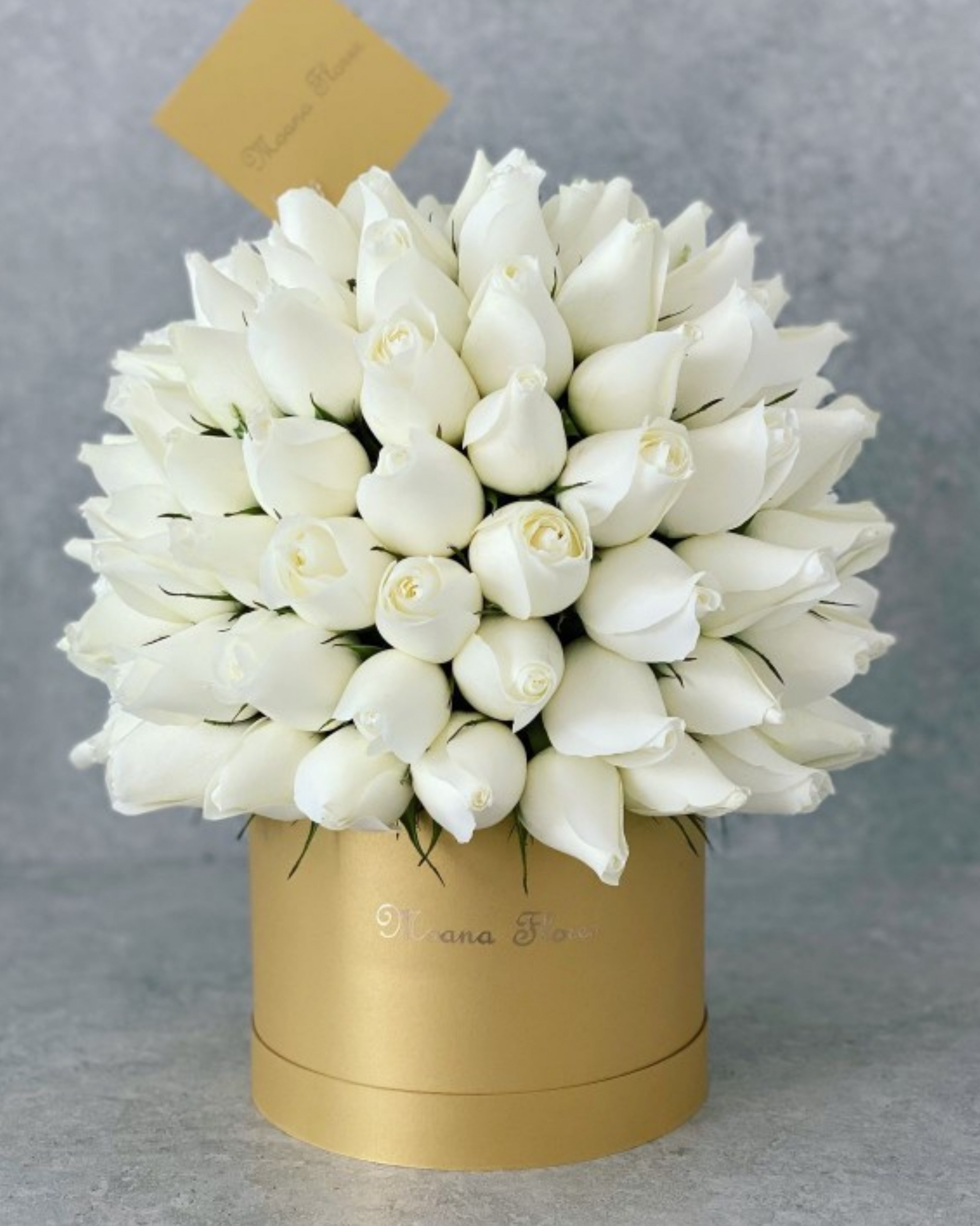 Este elegante arreglo en forma de domo presenta rosas blancas cuidadosamente dispuestas en una caja circular alta dorada. Ideal para transmitir pureza y sofisticación, este detalle floral aporta un toque refinado y lujoso, perfecto para sorprender en cualquier ocasión especial.