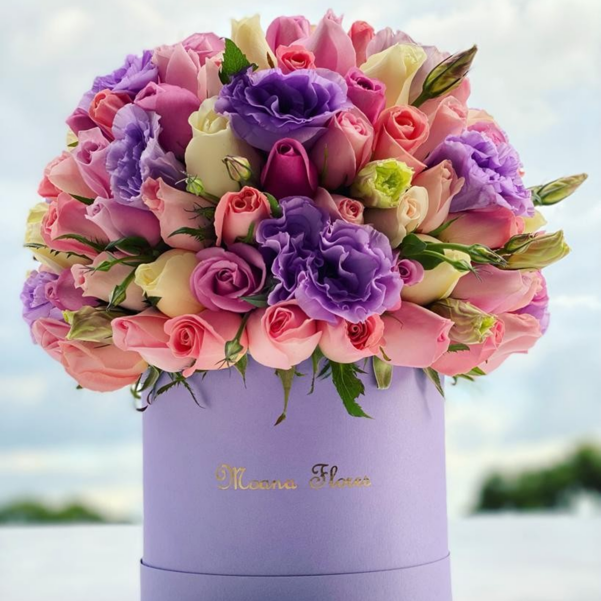 Este sofisticado arreglo en forma de domo combina rosas moradas, caricias, hermosas, náutica, blancas y lisianthus lila, presentado en una elegante caja alta morada. Perfecto para transmitir delicadeza y estilo, este detalle floral aporta un toque armonioso y vibrante, ideal para sorprender en cualquier ocasión especial.