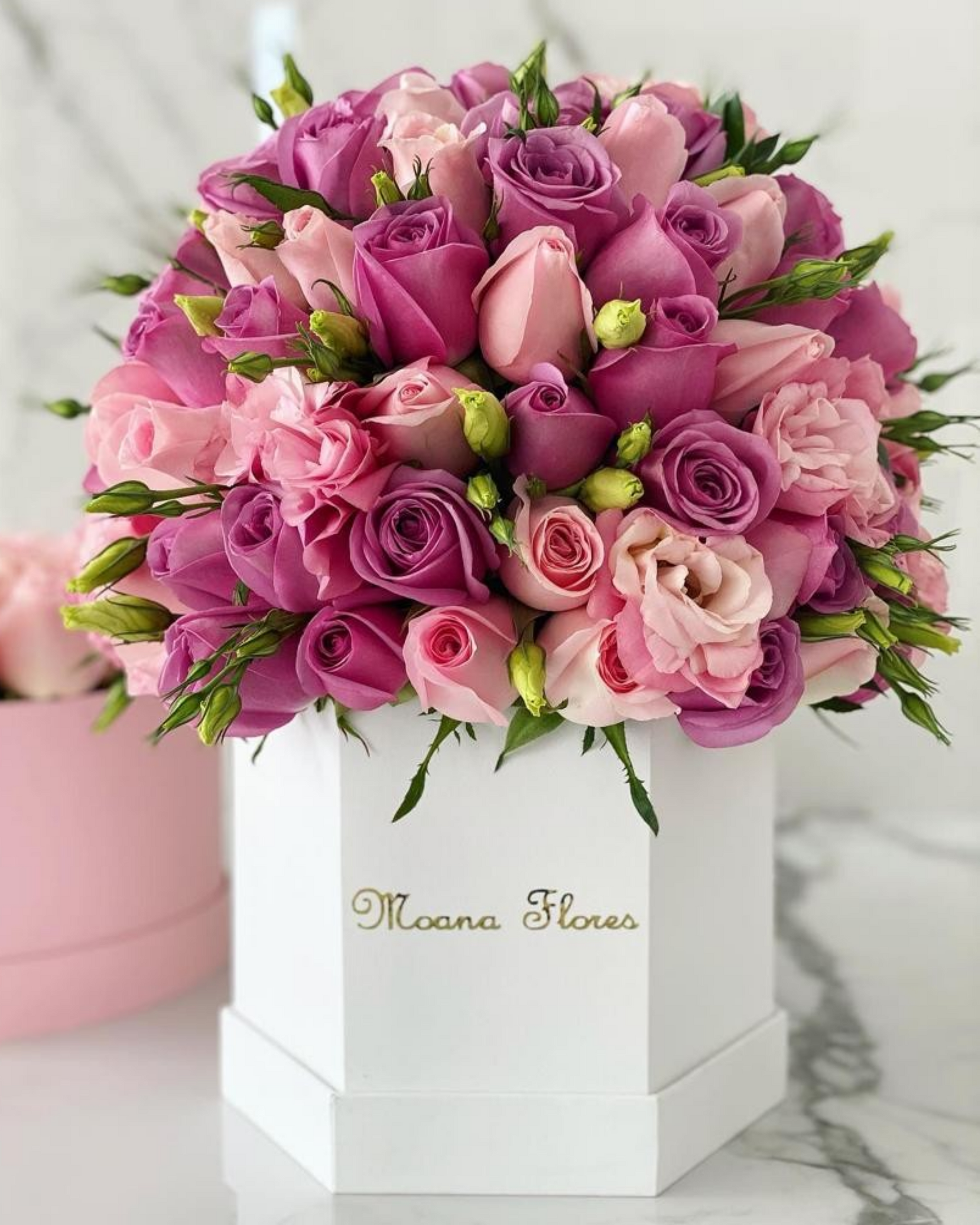 Este sofisticado arreglo en forma de domo combina rosas moradas, caricias y lisianthus rosa, presentado en una elegante caja hexagonal alta blanca. Perfecto para transmitir delicadeza y estilo, este detalle floral aporta un toque refinado y armonioso, ideal para realzar cualquier ocasión especial.