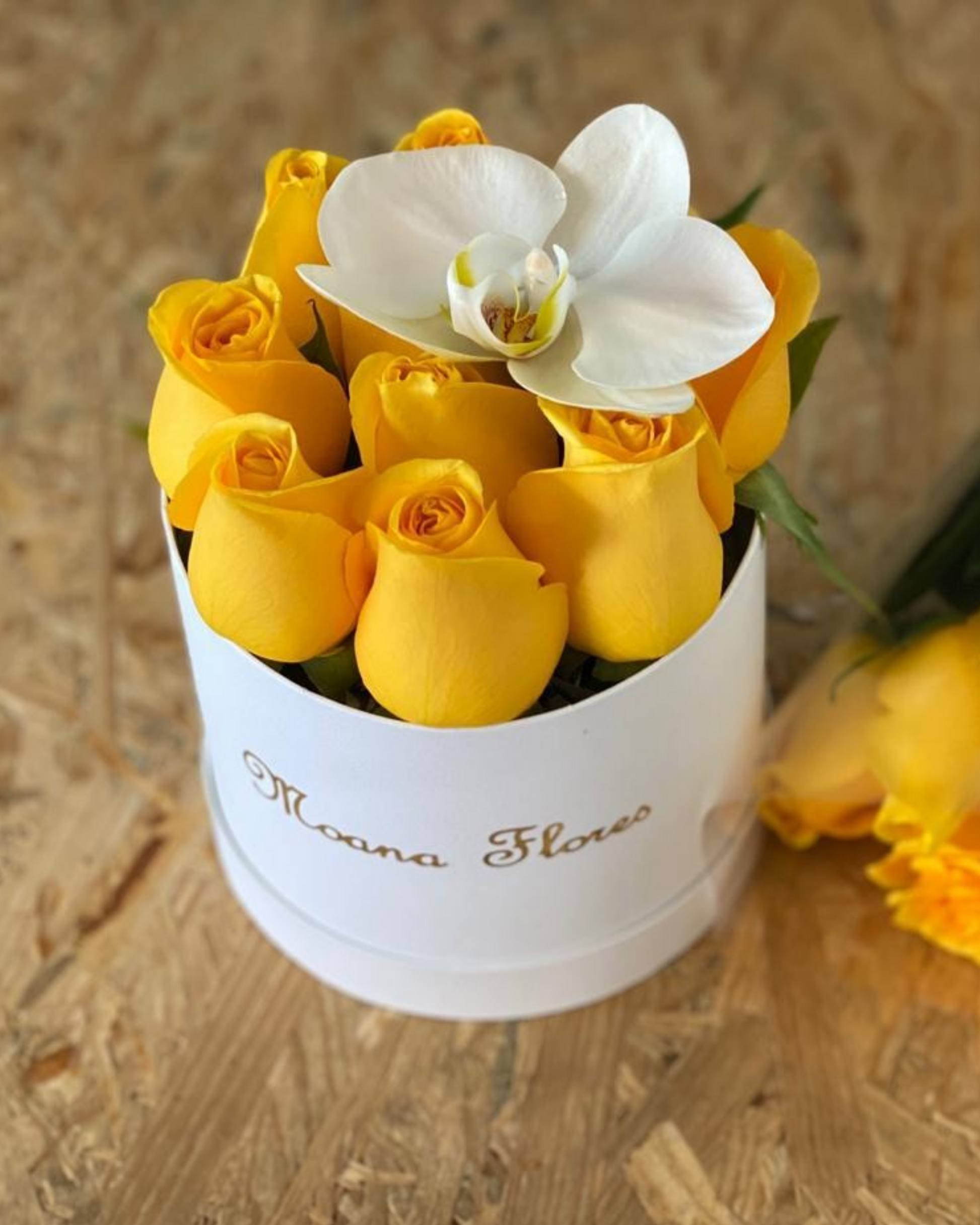 Este delicado arreglo combina rosas amarillas vibrantes con una elegante orquídea blanca, presentado en una caja pequeña circular blanca. Perfecto para transmitir alegría y sofisticación en un detalle compacto, ideal para sorprender y llenar de frescura cualquier momento especial.