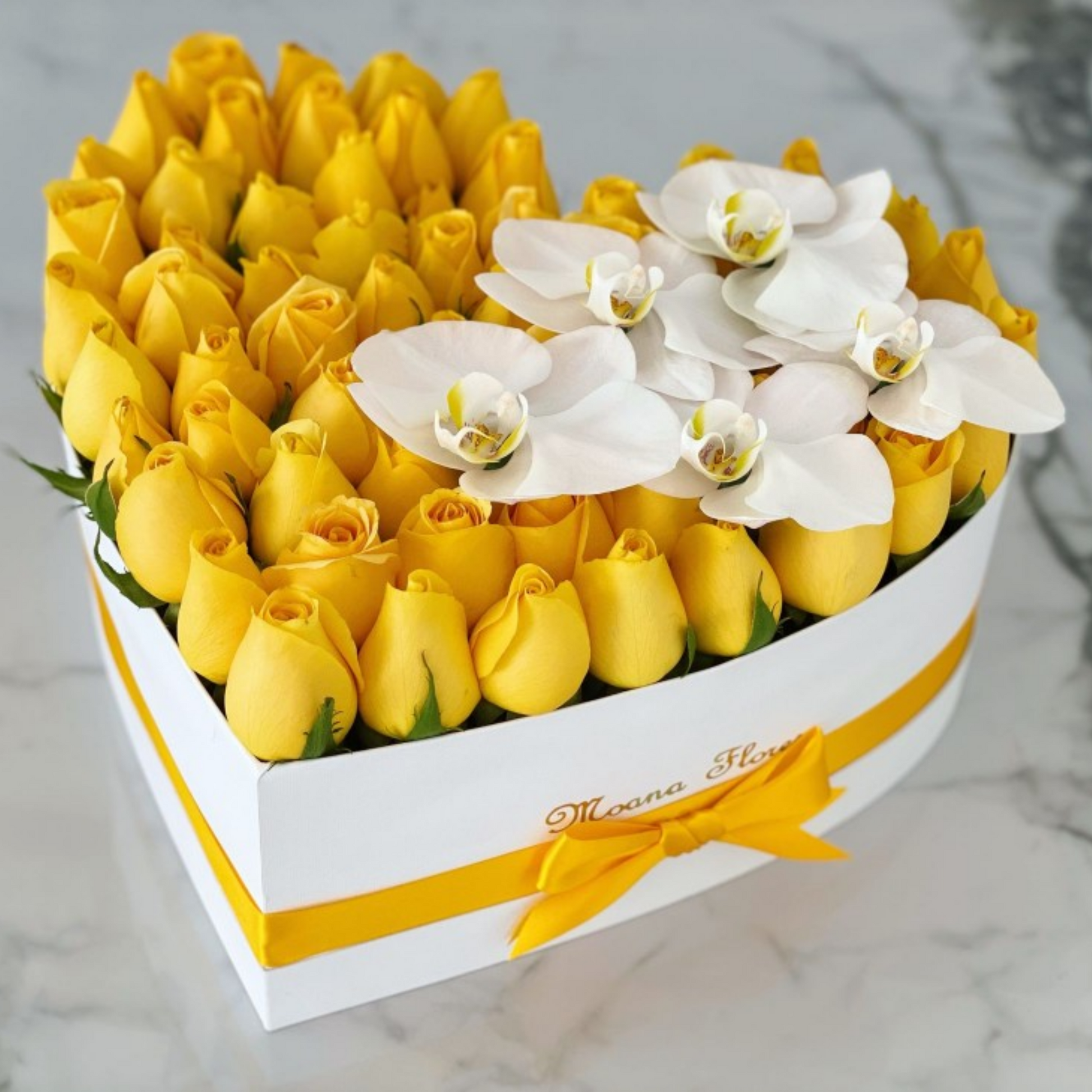 Este encantador arreglo combina rosas amarillas y orquídeas, presentado en una caja de corazón blanca adornada con un delicado listón amarillo. Perfecto para transmitir alegría y cariño, este detalle floral aporta un toque fresco y elegante, ideal para sorprender en cualquier ocasión especial.