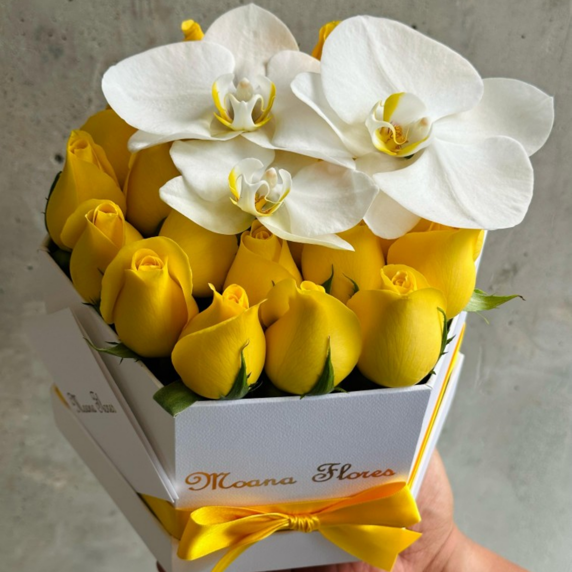 Este elegante arreglo combina rosas amarillas y orquídeas blancas, presentadas en una caja hexagonal adornada con un delicado listón amarillo. Perfecto para transmitir alegría y sofisticación, este detalle floral aporta un toque fresco y armonioso, ideal para sorprender en cualquier ocasión especial.