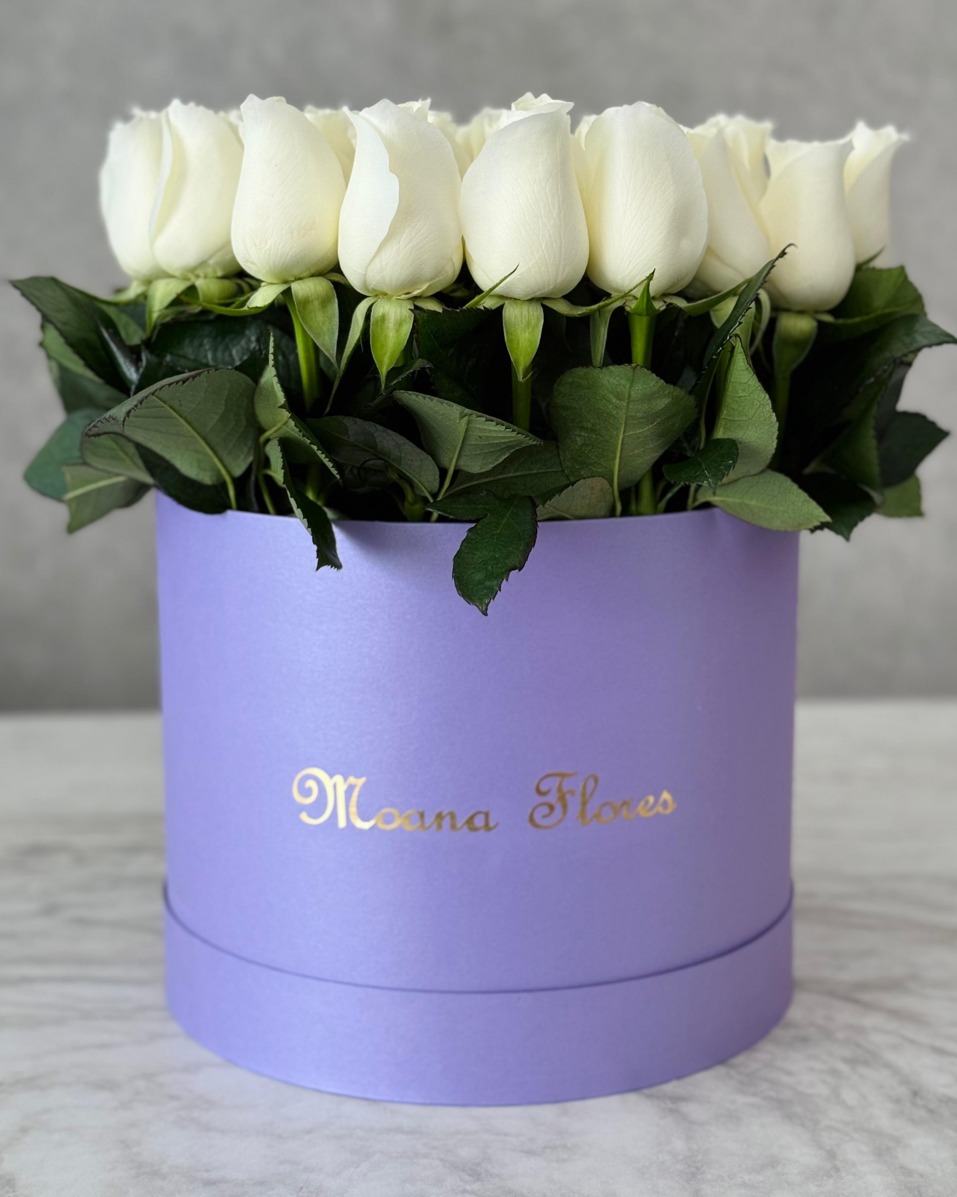 Este delicado arreglo de rosas blancas con follaje fresco está presentado en una elegante caja circular alta morada. Perfecto para transmitir pureza y serenidad con un toque sofisticado, ideal para sorprender y hacer inolvidable cualquier ocasión especial. Regala un detalle lleno de estilo y frescura que cautiva desde el primer momento.