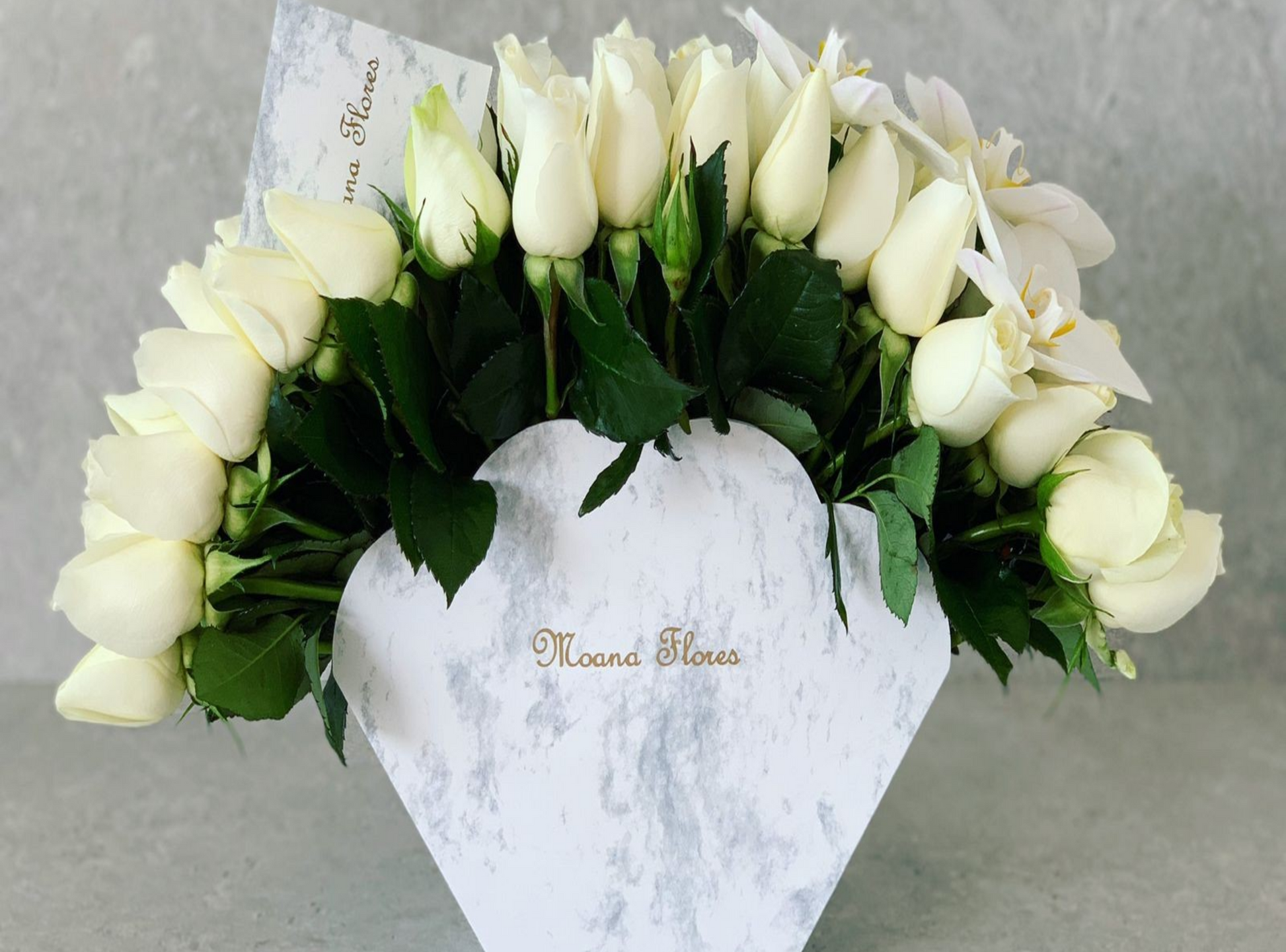 Este elegante arreglo en forma de abanico combina rosas blancas con orquídeas, presentado en una sofisticada caja de mármol gris. Perfecto para transmitir pureza y estilo, este detalle floral aporta un toque refinado y moderno, ideal para sorprender en cualquier ocasión especial.