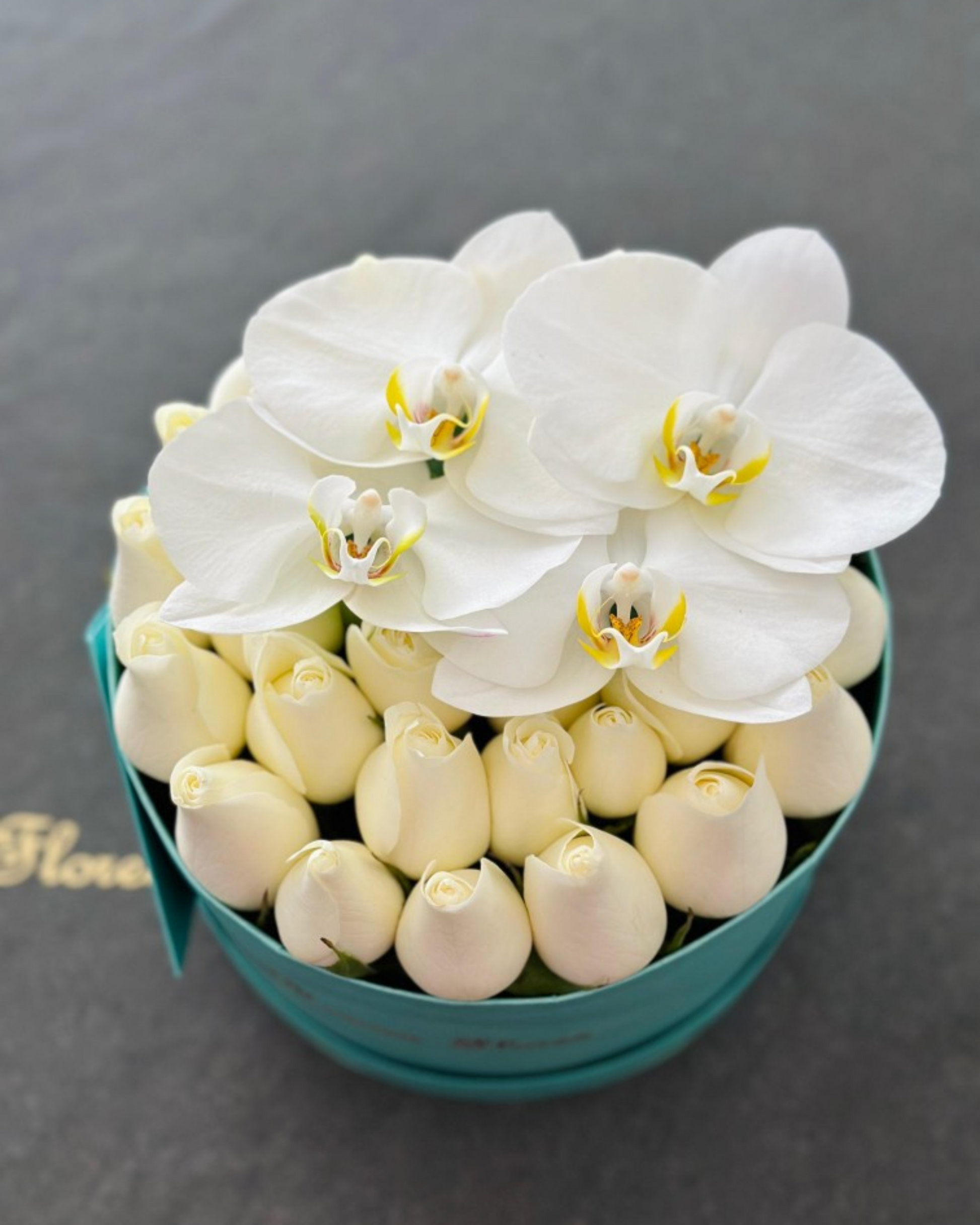 Este elegante arreglo combina rosas blancas y orquídeas blancas, cuidadosamente presentadas en una caja circular. Perfecto para transmitir pureza y sofisticación, este detalle floral aporta frescura y estilo a cualquier ocasión especial, ideal para sorprender con un toque delicado y refinado.