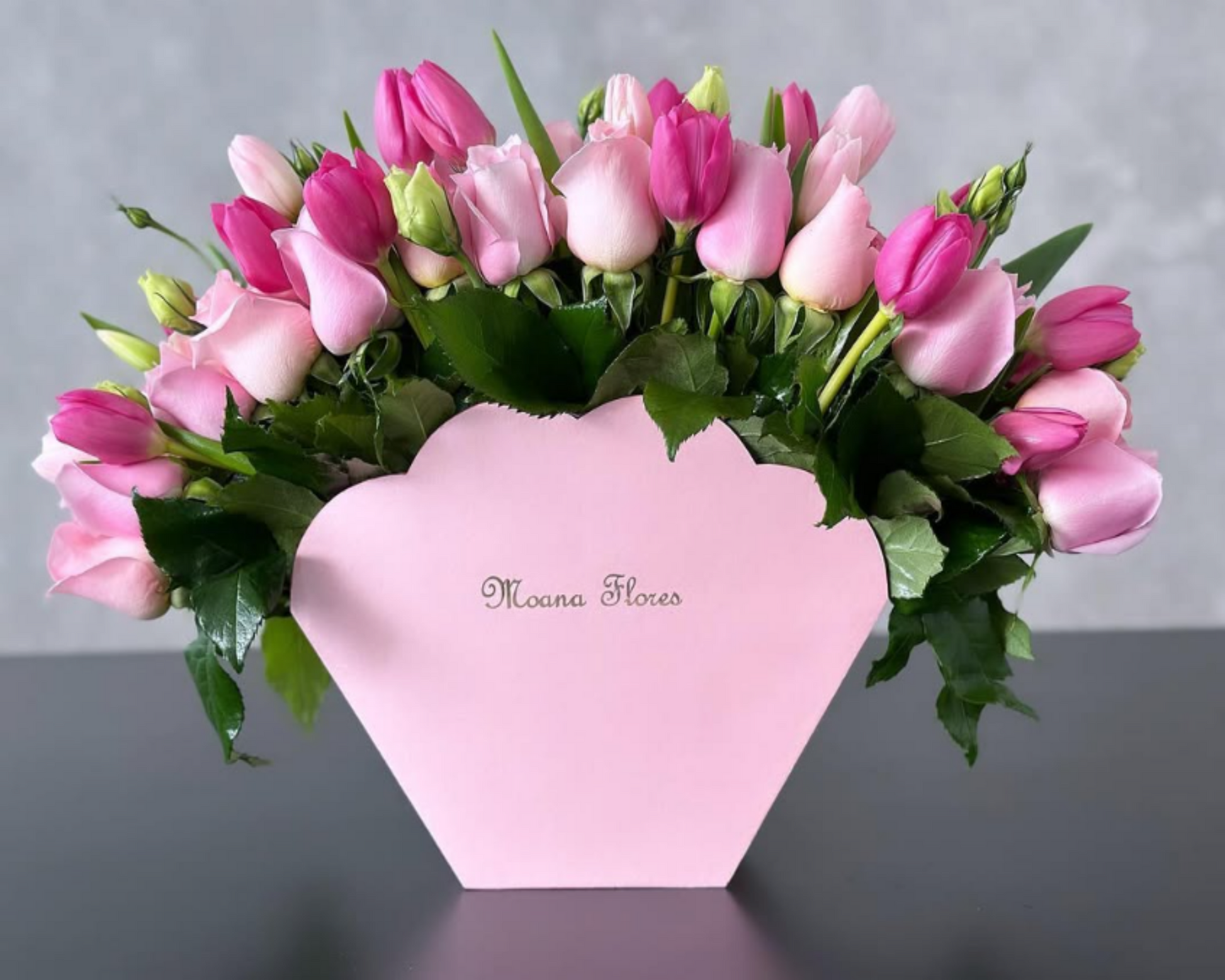 Este elegante arreglo en forma de abanico combina rosas caricia con lisianthus rosa, tulipanes y follaje, presentado en una delicada caja rosa. Un detalle lleno de frescura y armonía, ideal para expresar cariño y estilo en cualquier ocasión especial. Regala un gesto lleno de belleza y emoción que cautiva desde el primer instante.