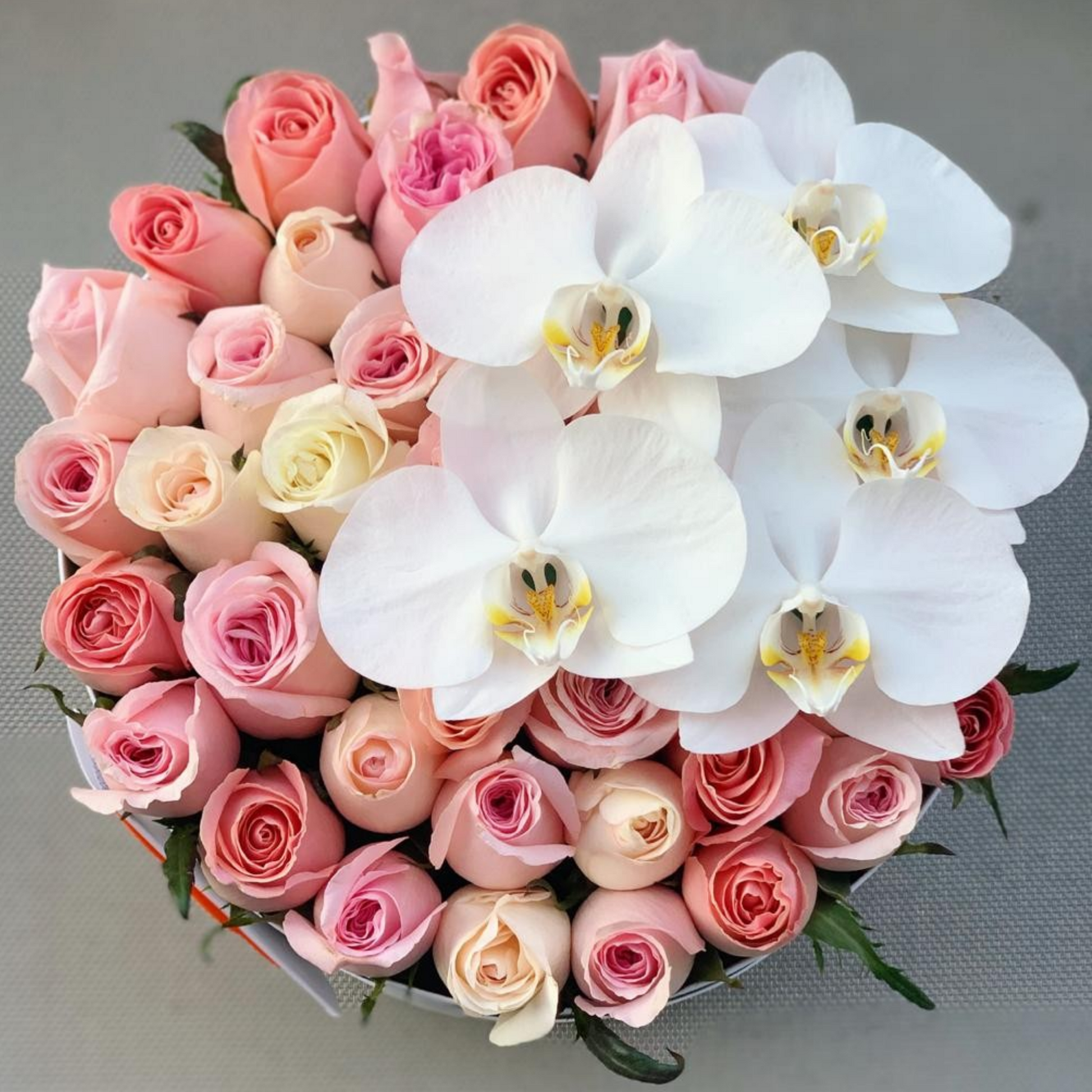 Este delicado arreglo combina rosas caricias, hermosas, señoritas y orquídeas blancas, presentado en una elegante caja circular blanca. Perfecto para transmitir pureza y sofisticación, este detalle floral aporta un toque de frescura y estilo, ideal para sorprender en cualquier ocasión especial.