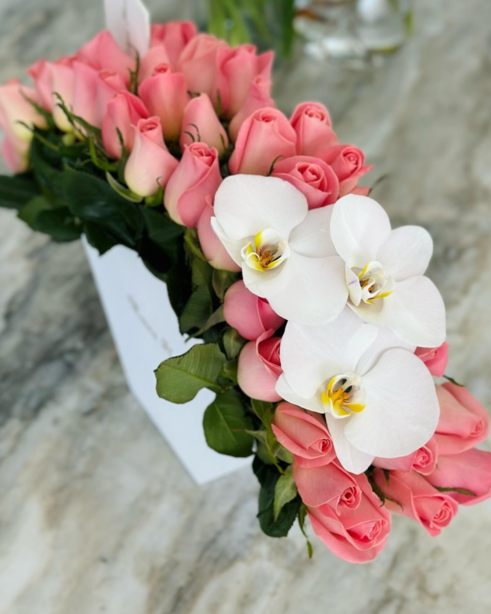 Este arreglo audaz presenta rosas hermosas combinadas con orquídeas y follaje, dispuestas en forma de abanico dentro de una elegante caja blanca. Su diseño impactante y moderno es perfecto para quienes desean sorprender con un detalle floral único y lleno de personalidad en cualquier ocasión especial.