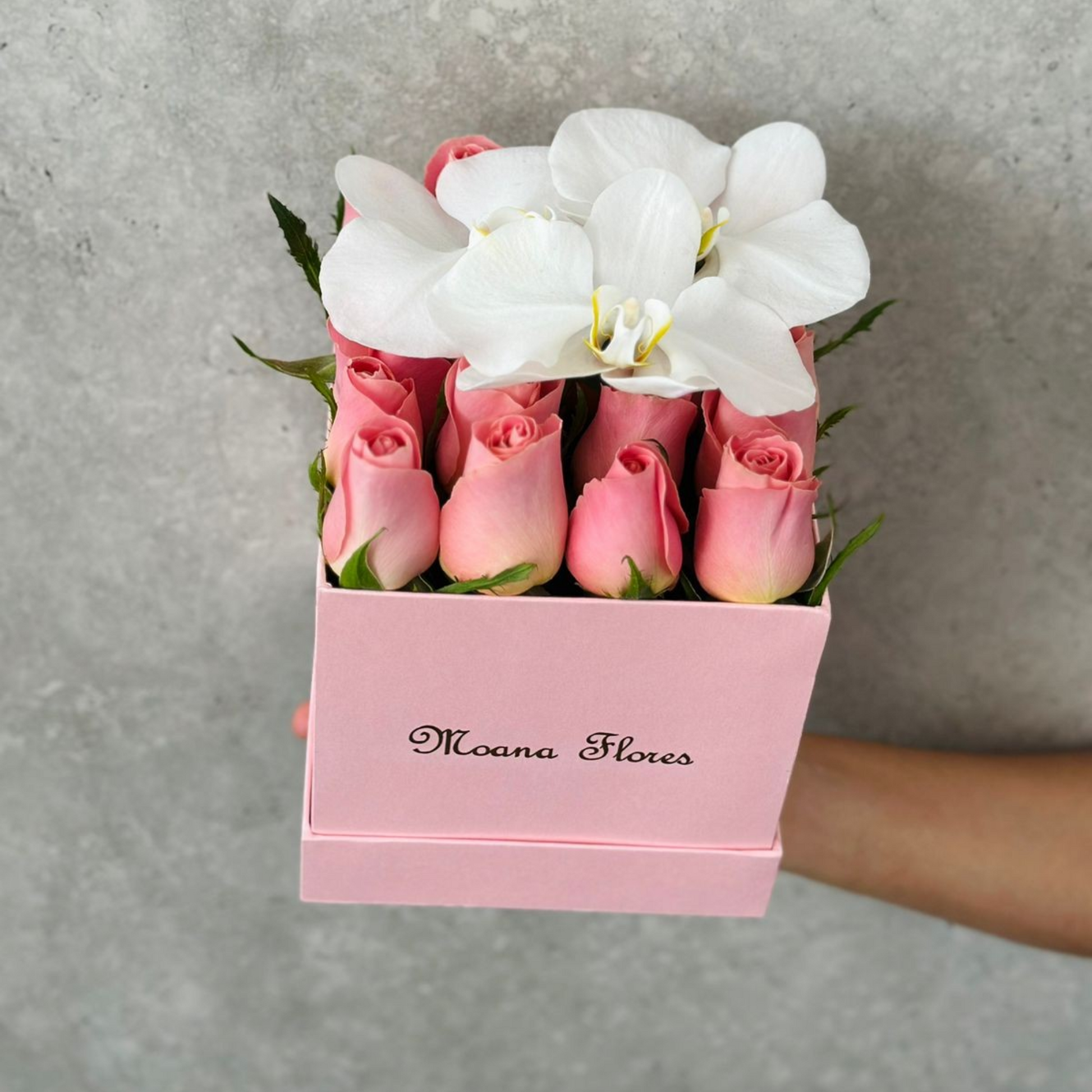 Este elegante arreglo combina rosas hermosas con orquídeas blancas, presentado en una delicada caja cuadrada rosa. Perfecto para transmitir ternura y sofisticación, este detalle floral aporta un toque fresco y encantador, ideal para sorprender en cualquier ocasión especial.