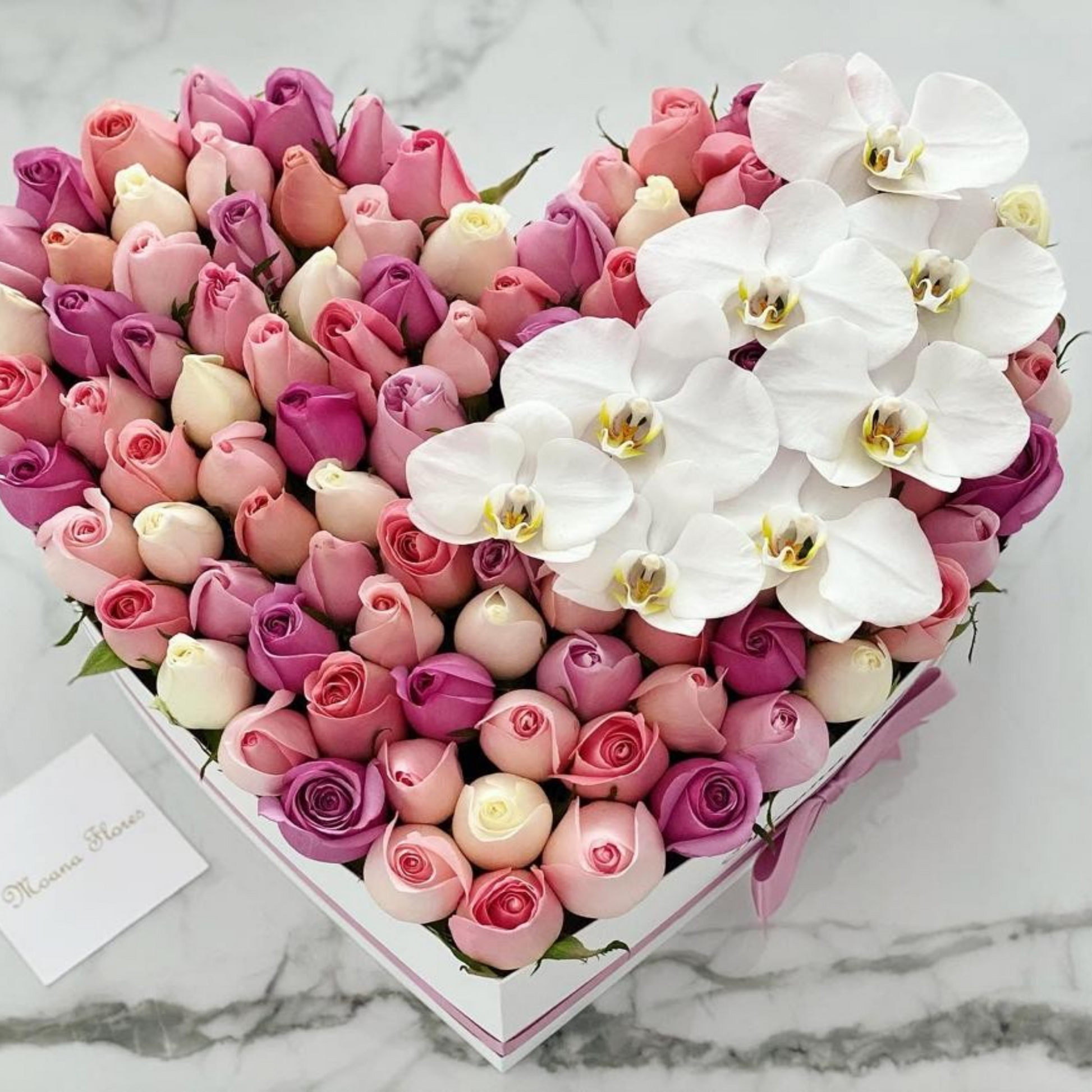 Este sofisticado arreglo combina rosas moradas, hermosas, caricia, blancas y náutica con orquídeas blancas, presentado en una caja de corazón blanca adornada con un elegante listón morado. Perfecto para transmitir delicadeza y estilo, este detalle floral aporta un toque romántico y refinado, ideal para sorprender en cualquier ocasión especial.