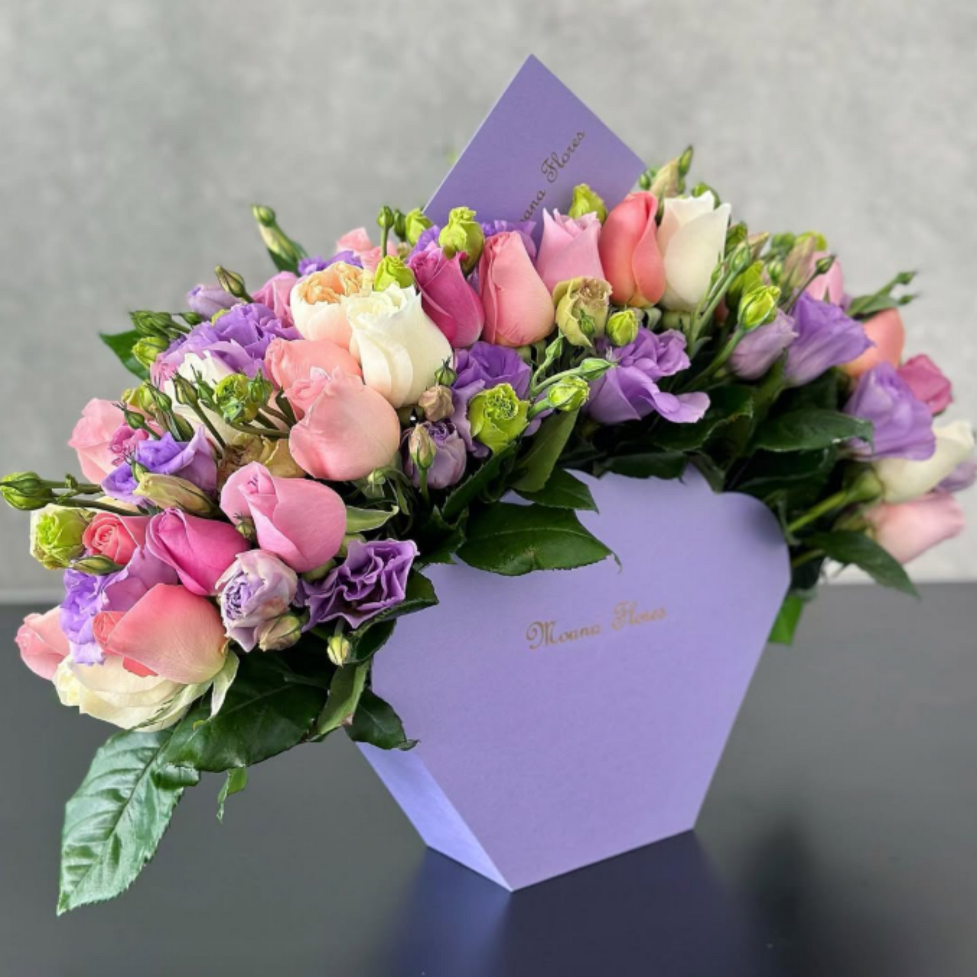 Este hermoso arreglo en forma de abanico combina rosas blancas y moradas, caricias, señoritas, lisianthus morado y verde, presentado en una elegante caja morada. Perfecto para transmitir frescura y sofisticación, este detalle floral aporta un toque armonioso y encantador, ideal para sorprender en cualquier ocasión especial.