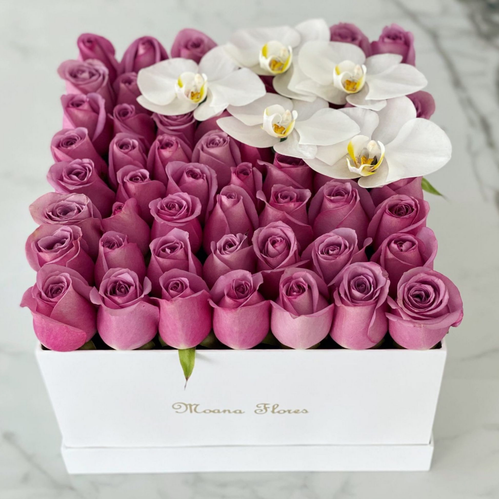 Este sofisticado arreglo combina rosas moradas con orquídeas blancas, elegantemente presentadas en una caja cuadrada blanca. Ideal para transmitir elegancia y frescura, este detalle floral aporta un contraste armonioso y un toque de distinción, perfecto para sorprender en cualquier ocasión especial.