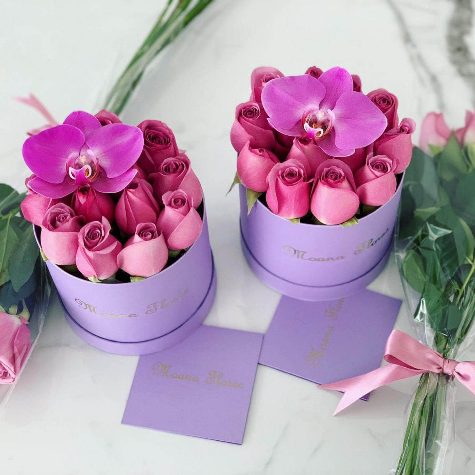Este delicado arreglo combina rosas moradas y orquídeas moradas, presentado en una caja pequeña circular morada. Ideal para transmitir elegancia y sofisticación, este detalle floral aporta un toque de color y estilo, perfecto para sorprender en cualquier ocasión especial. Precio individual.
