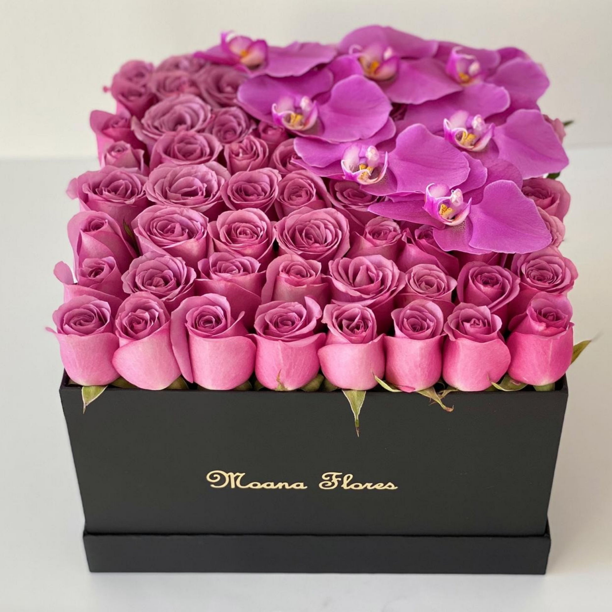 Este sofisticado arreglo combina rosas moradas y orquídeas moradas, elegantemente presentadas en una caja cuadrada negra. Ideal para transmitir lujo y distinción, este detalle floral aporta un toque de profundidad y elegancia, perfecto para sorprender en cualquier ocasión especial.