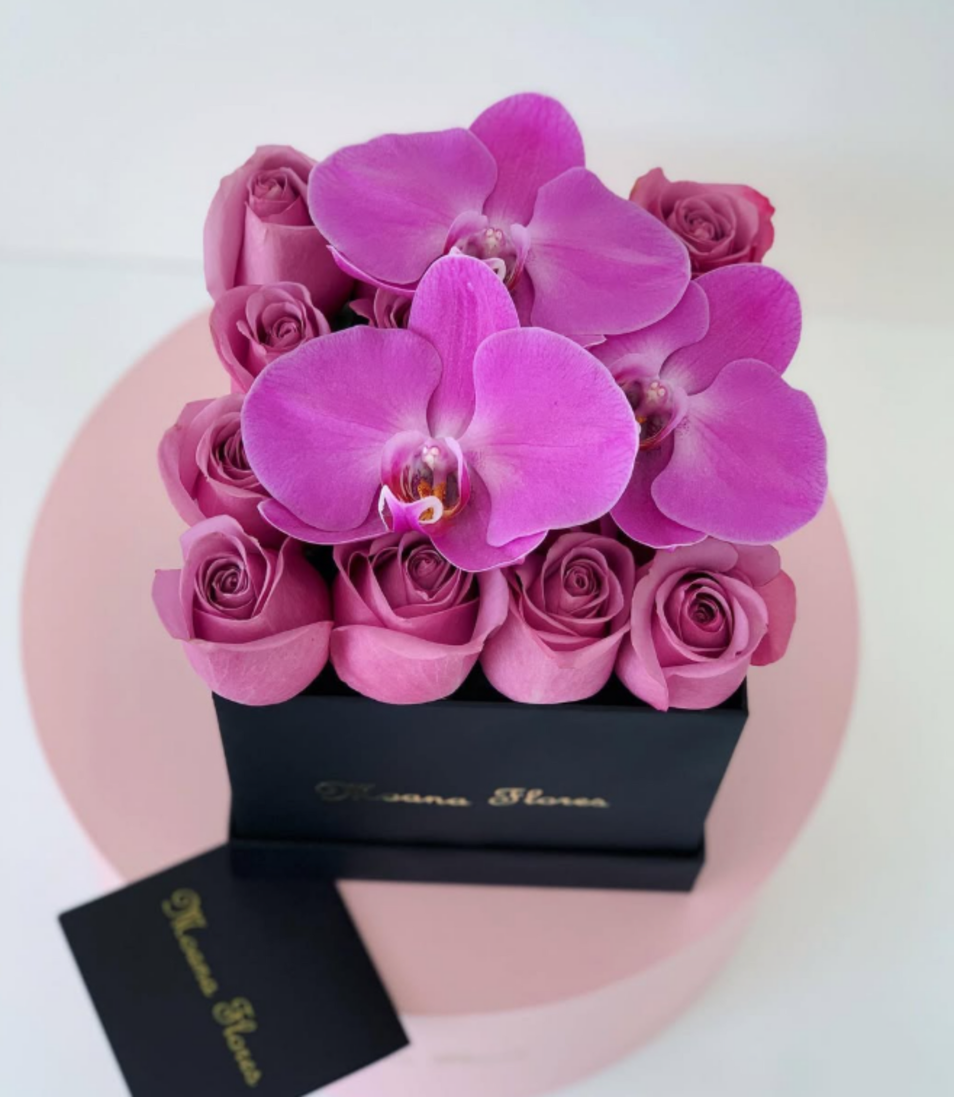 Este sofisticado arreglo combina rosas moradas y orquídeas moradas, elegantemente presentadas en una caja cuadrada negra. Ideal para transmitir lujo y distinción, este detalle floral aporta un toque de profundidad y elegancia, perfecto para sorprender en cualquier ocasión especial.