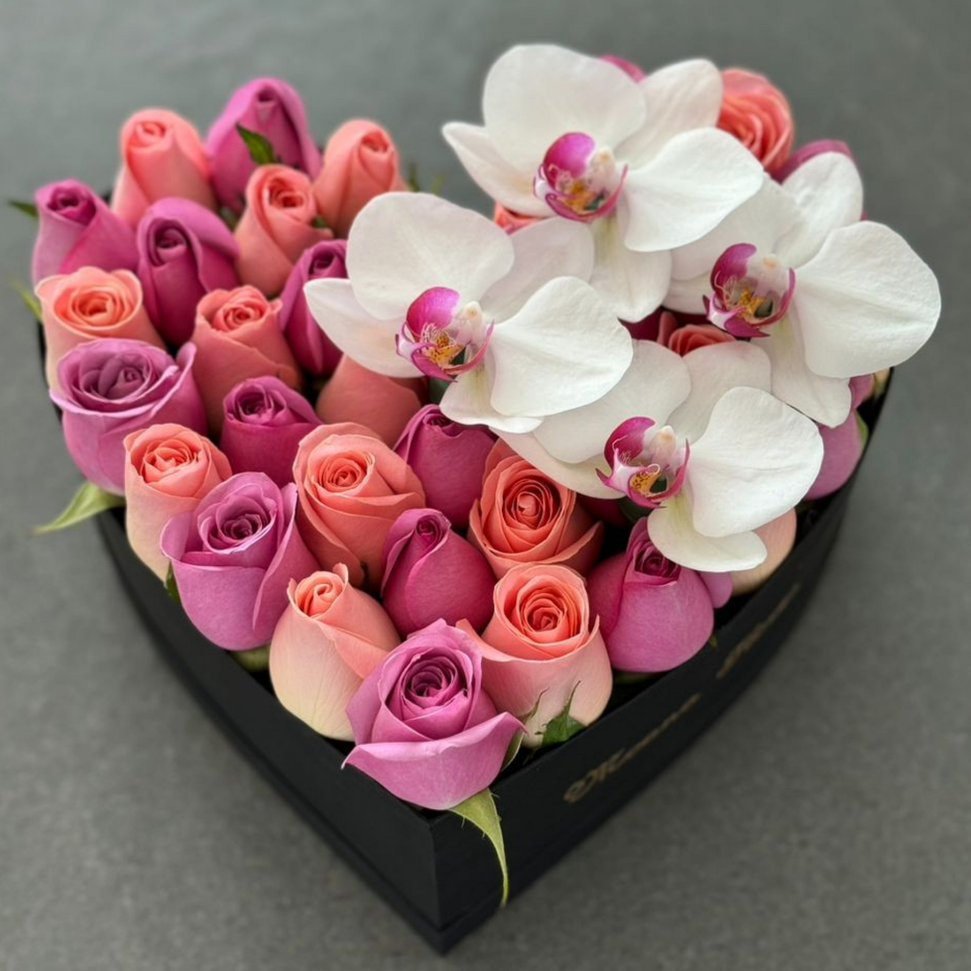 Este sofisticado arreglo combina rosas moradas y hermosas con orquídeas, presentado en una elegante caja de corazón negro pequeña. Perfecto para transmitir elegancia y profundidad, este detalle floral aporta un toque de estilo y distinción, ideal para sorprender en cualquier ocasión especial.