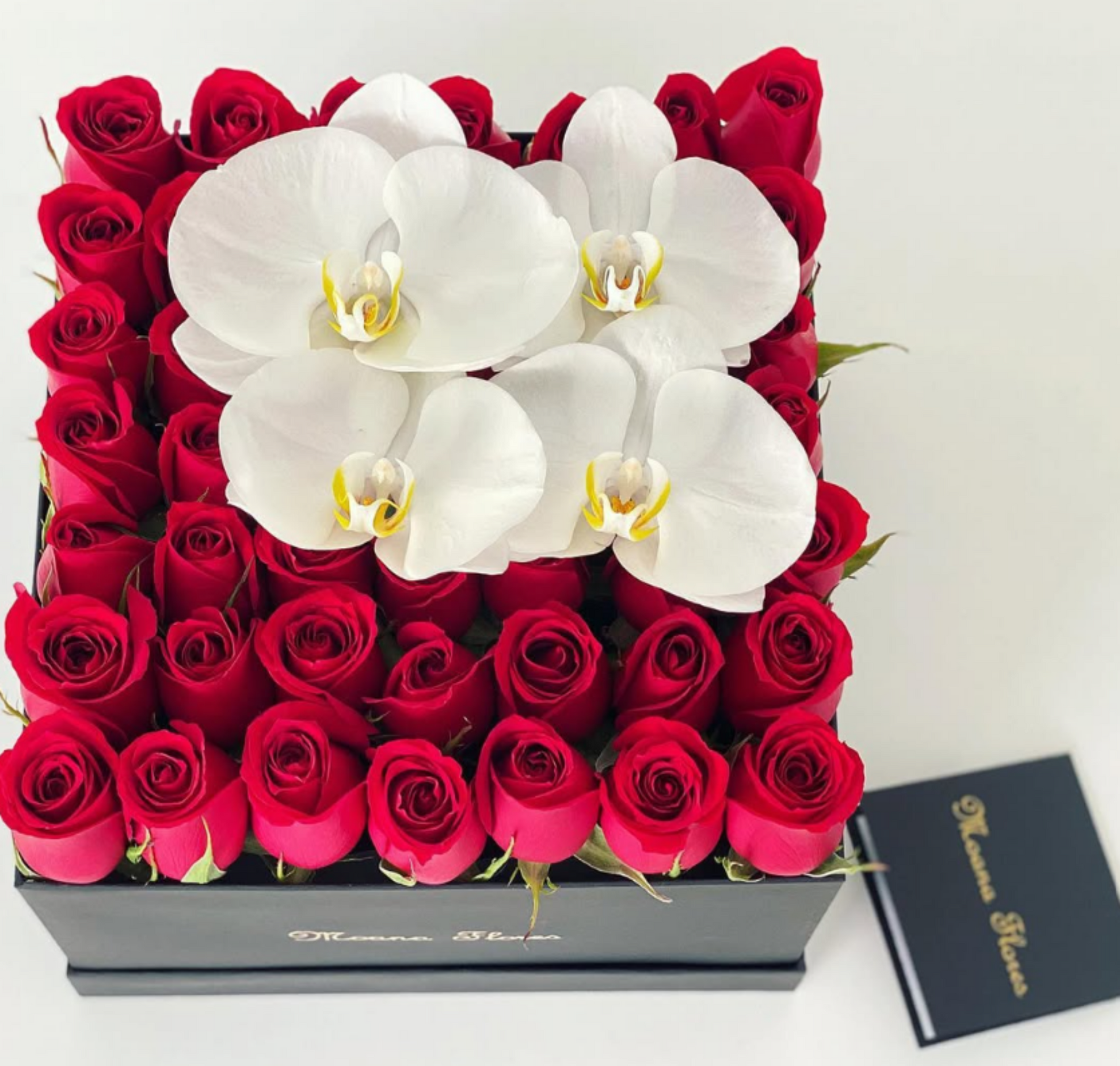 Este sofisticado arreglo combina rosas rojas intensas con orquídeas blancas, cuidadosamente dispuestas en una elegante caja cuadrada negra. Una combinación que expresa pasión y pureza, perfecta para sorprender y transmitir sentimientos profundos con estilo y distinción. Regala un detalle único que hará memorable cualquier ocasión especial.