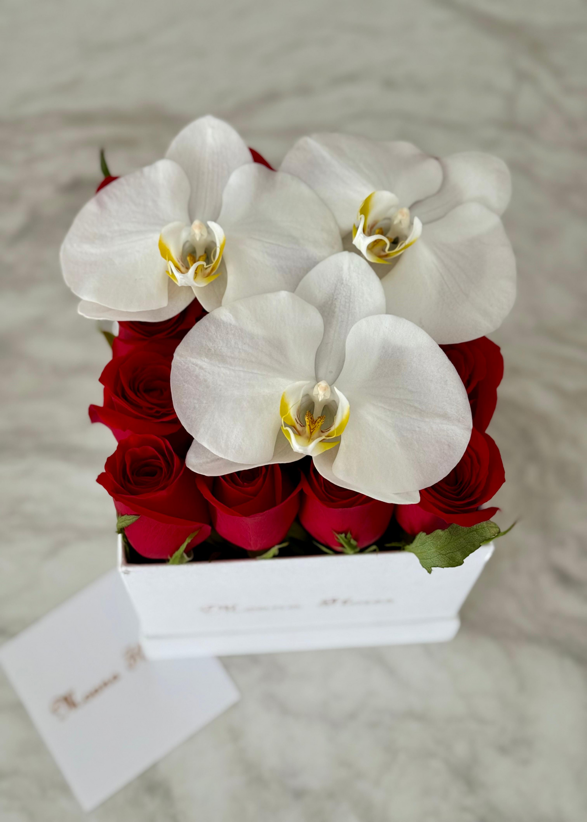 Este elegante arreglo combina rosas rojas vibrantes con delicadas orquídeas, presentadas en una sofisticada caja cuadrada blanca. La armonía entre la pasión de las rosas y la elegancia de las orquídeas crea un detalle perfecto para expresar amor y admiración en cualquier ocasión especial. Regala belleza y estilo en un solo gesto inolvidable.