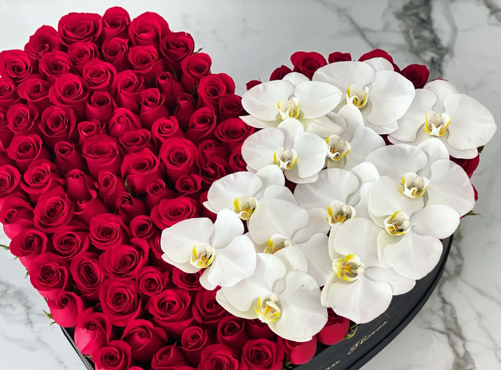 Este elegante arreglo combina rosas rojas vibrantes con delicadas orquídeas, cuidadosamente presentadas en una sofisticada caja en forma de corazón negra. Perfecto para expresar pasión y cariño con un detalle lleno de estilo, ideal para sorprender y hacer inolvidable cualquier ocasión especial. Regala un gesto que cautiva y emociona desde el primer instante.