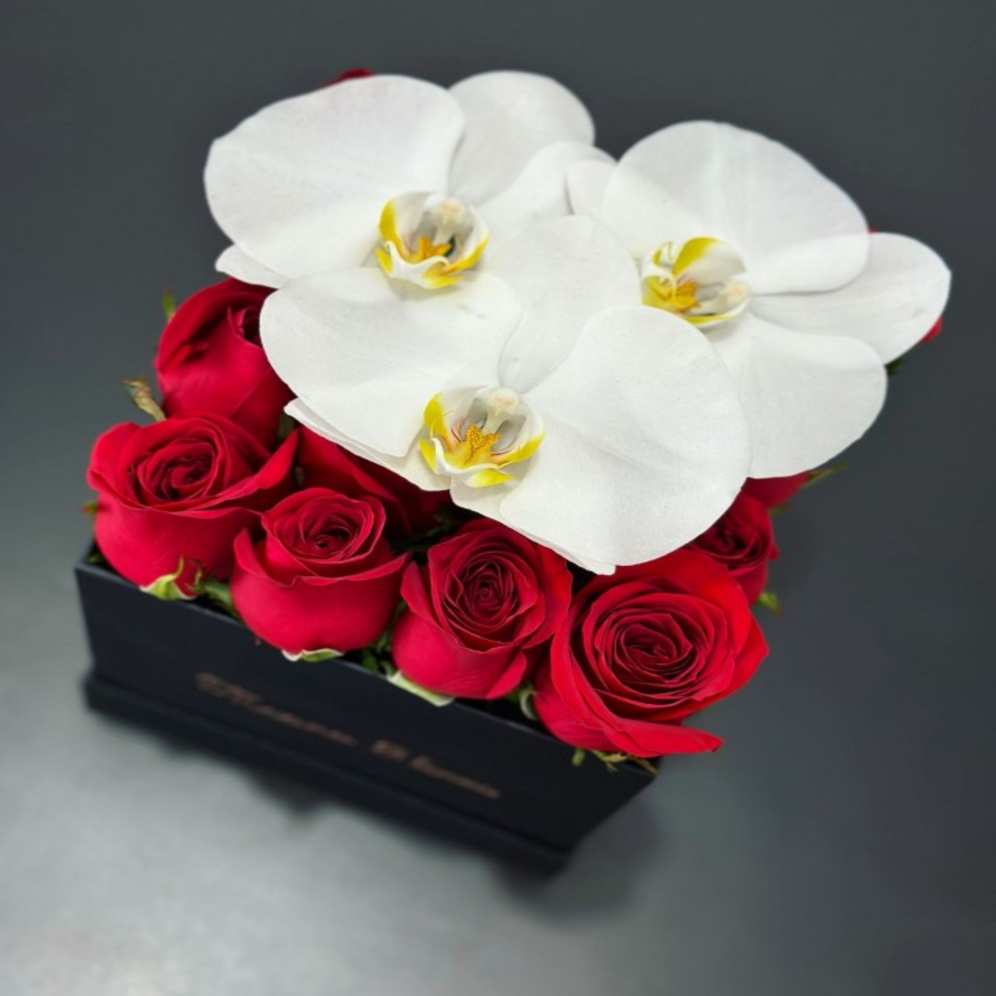 Rosas rojas con orquídeas blancas en caja cuadrada negra pequeña.
