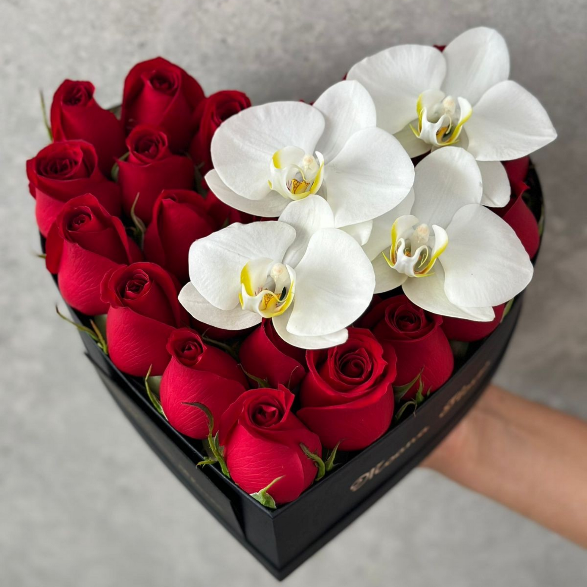 Rosas rojas con orquídeas blancas en caja de corazón negro mini.