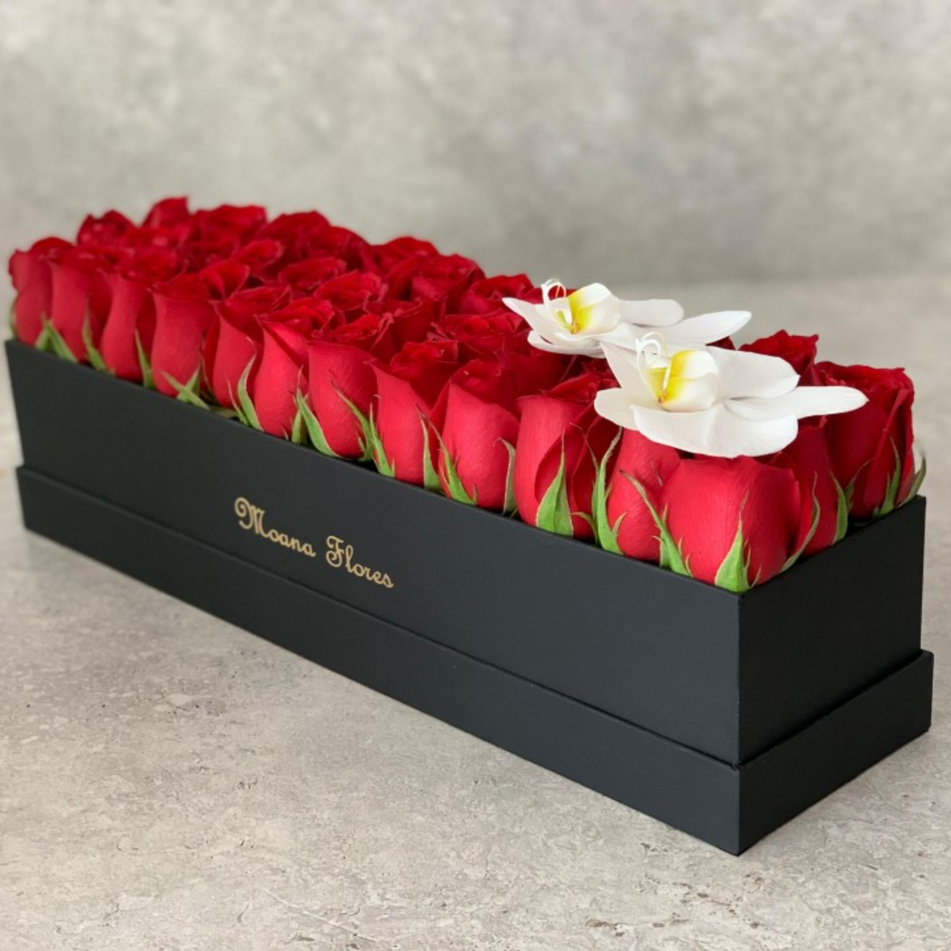 Este elegante arreglo combina rosas rojas intensas con delicadas orquídeas, cuidadosamente presentadas en una sofisticada caja rectangular negra. Una mezcla perfecta de pasión y elegancia, ideal para expresar tus sentimientos más profundos y sorprender en cualquier ocasión especial. Regala un detalle lleno de estilo y significado que cautiva desde el primer momento.