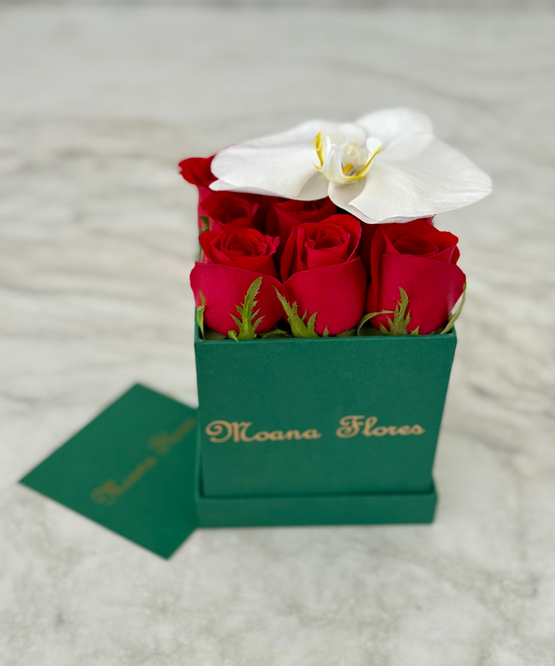 Este delicado arreglo presenta rosas rojas intensas cuidadosamente colocadas en una caja cuadrada de color verde pino. Un detalle pequeño pero lleno de significado, perfecto para expresar pasión y cariño con elegancia. Ideal para sorprender y transmitir tus emociones de manera sencilla pero memorable.