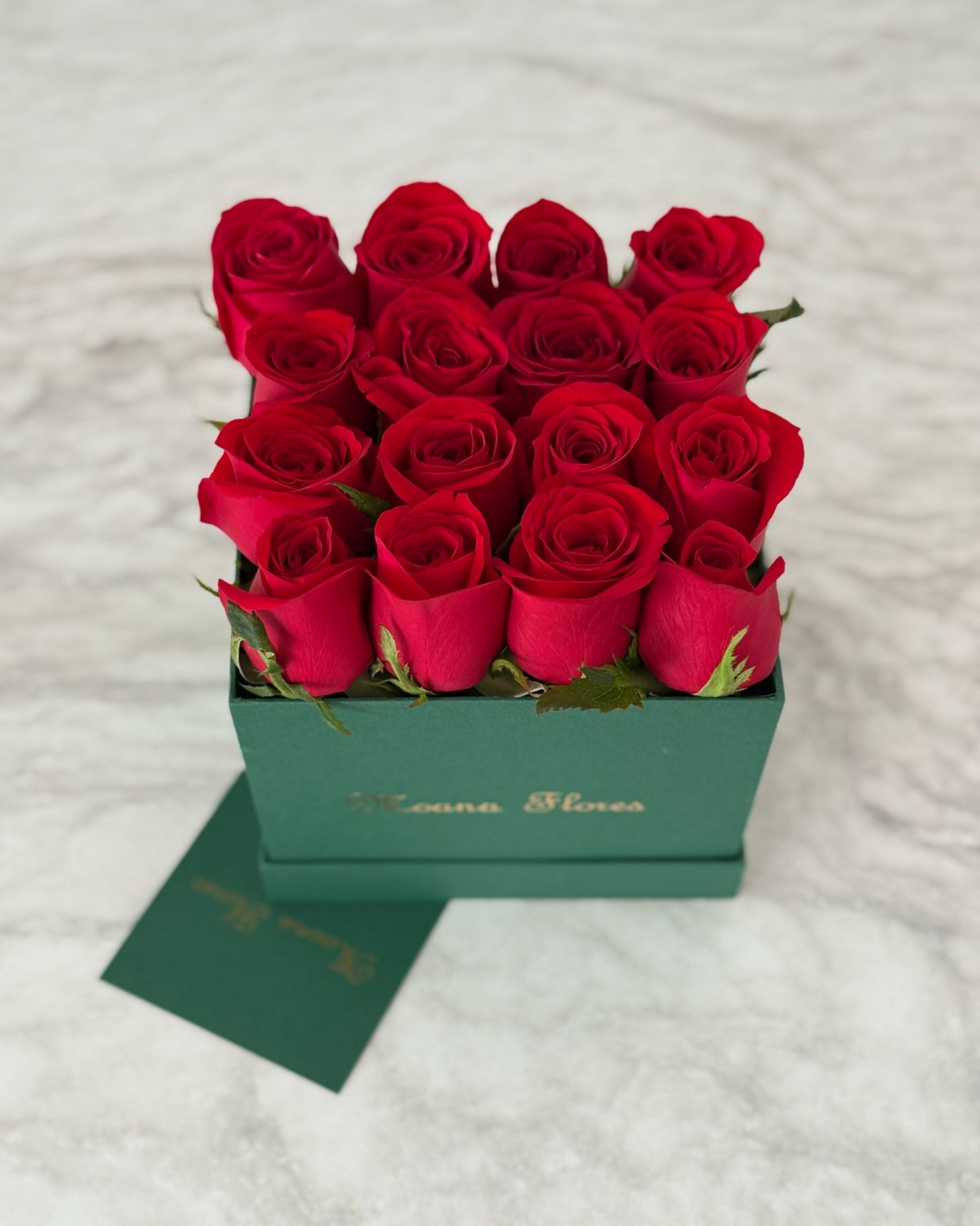Este elegante arreglo combina rosas rojas intensas con una sofisticada caja cuadrada de color verde pino, creando un contraste vibrante y armonioso. Perfecto para expresar sentimientos de pasión y cariño con un toque de distinción. Regala un detalle inolvidable que transmite emoción y estilo en cada ocasión especial.