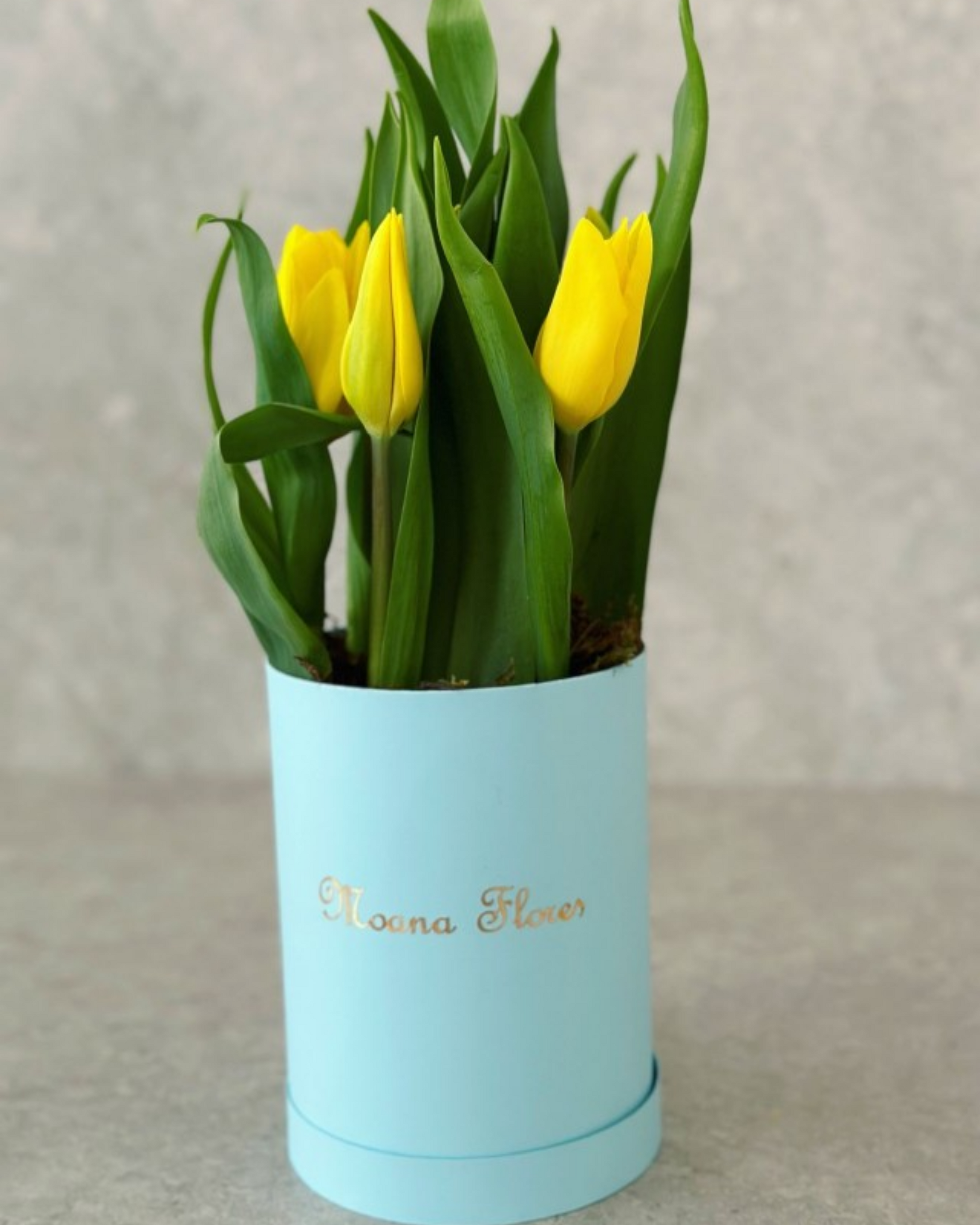Este elegante arreglo presenta tulipanes amarillos frescos, cuidadosamente dispuestos en una caja circular alta azul. Perfecto para transmitir alegría y sofisticación, este detalle floral aporta un toque vibrante y refinado, ideal para sorprender en cualquier ocasión especial.