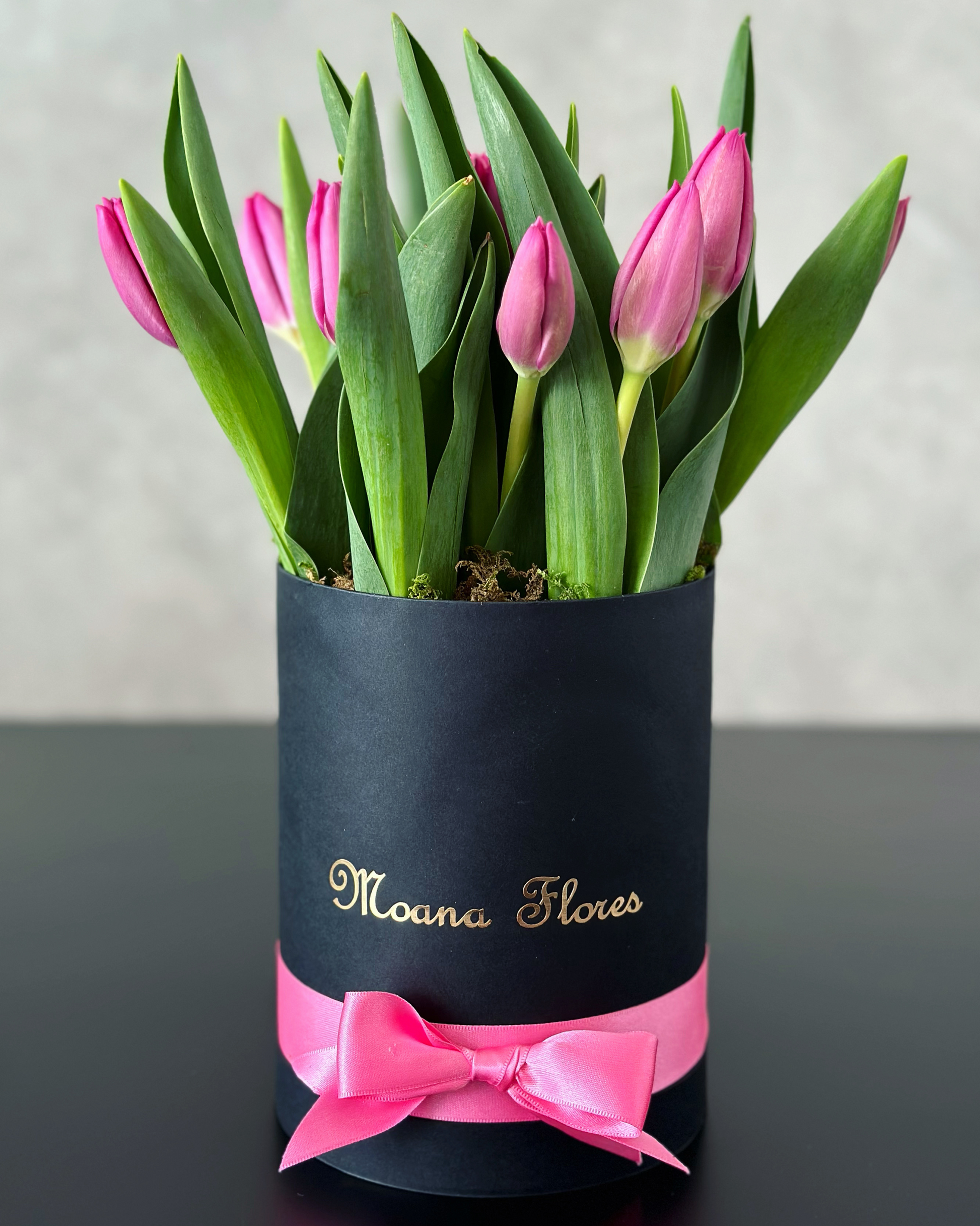 Este delicado arreglo presenta tulipanes rosas frescos, elegantemente dispuestos en una caja circular alta negra adornada con un listón rosa. Perfecto para transmitir ternura y sofisticación, este detalle floral aporta un toque encantador y refinado, ideal para sorprender en cualquier ocasión especial.