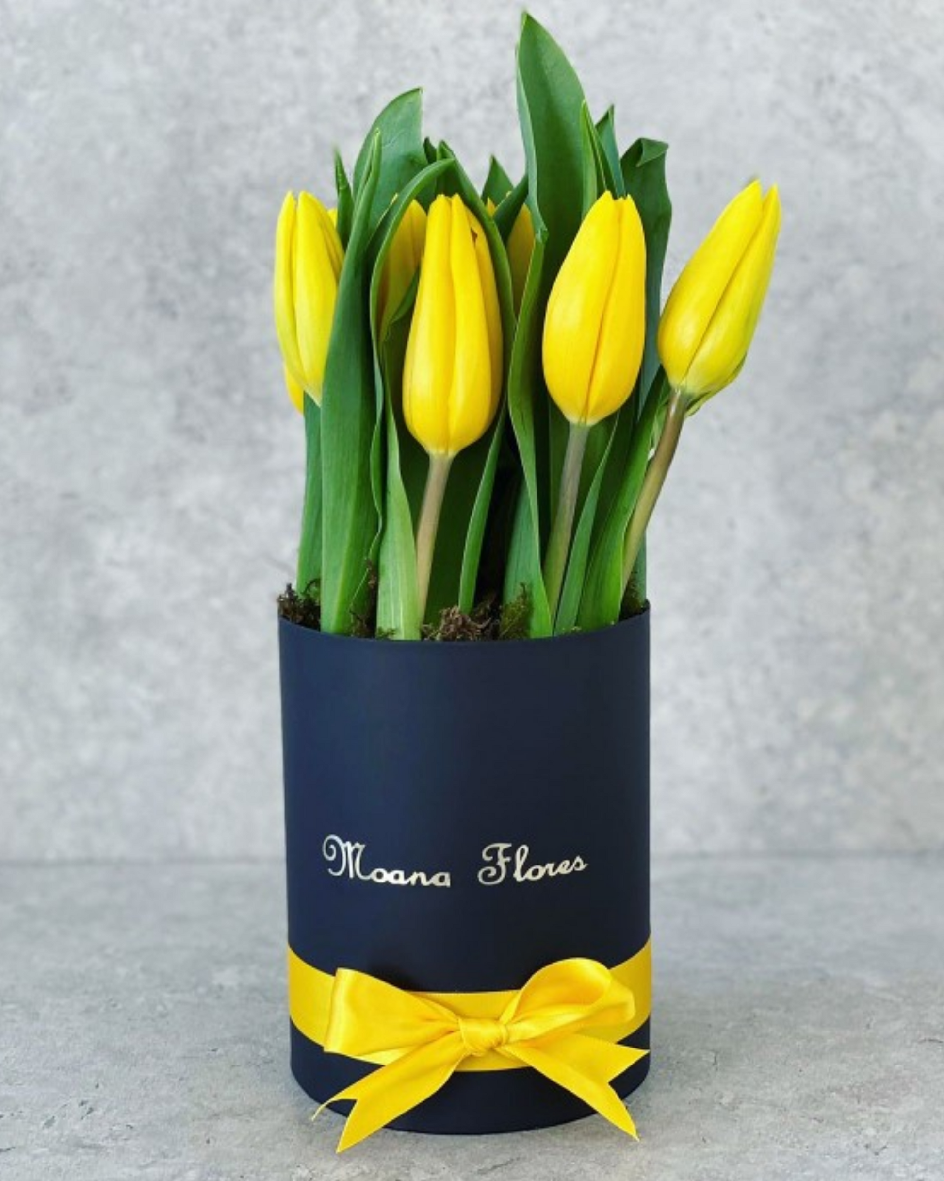 Este elegante arreglo presenta tulipanes amarillos frescos, cuidadosamente dispuestos en una caja circular alta negra adornada con un listón amarillo. Perfecto para transmitir alegría y sofisticación, este detalle floral aporta un toque vibrante y refinado, ideal para sorprender en cualquier ocasión especial.