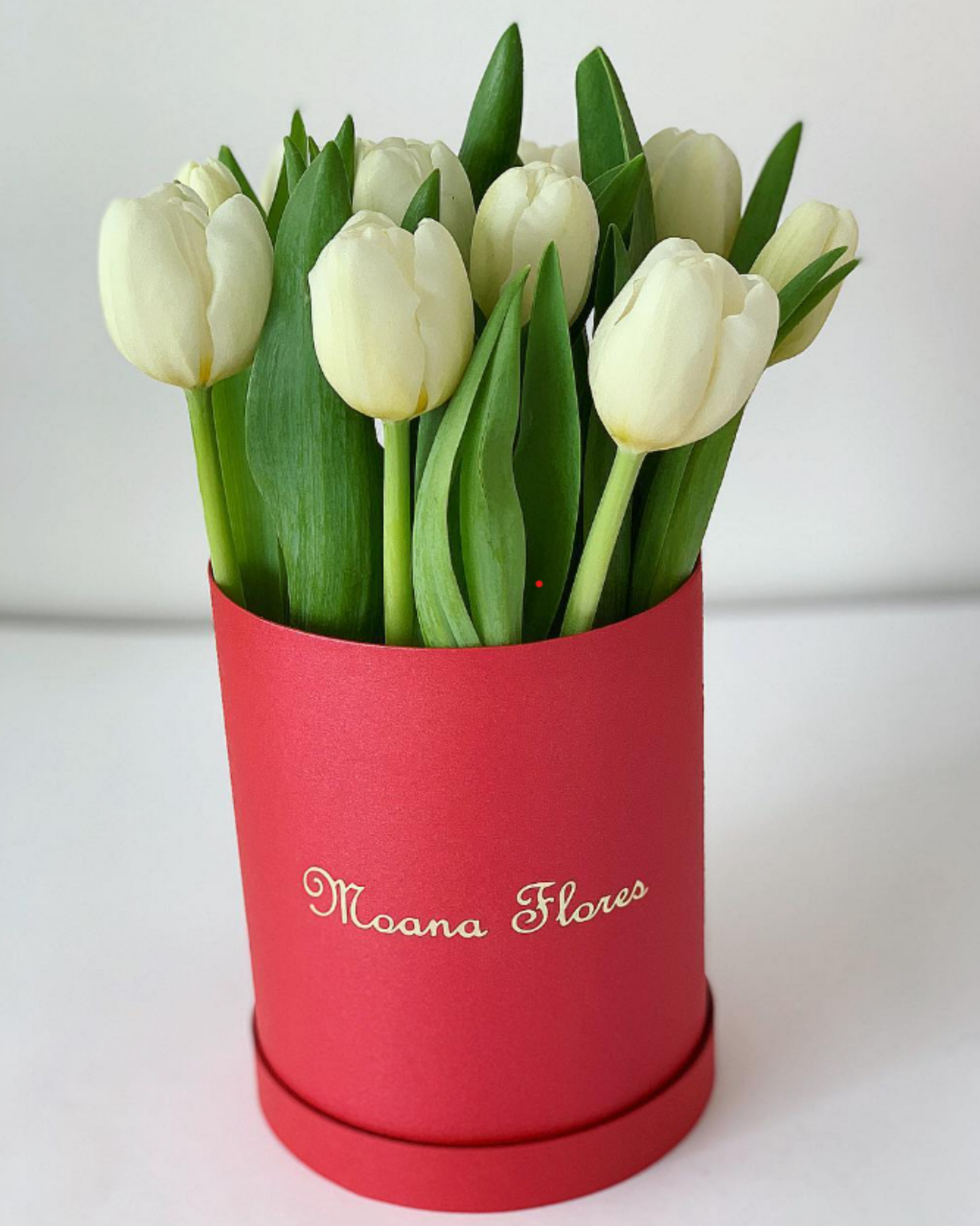 Este elegante arreglo de tulipanes blancos, presentado en una caja alta roja, combina pureza y sofisticación. Perfecto para transmitir delicadeza y estilo, este detalle floral aporta un toque fresco y vibrante, ideal para sorprender en cualquier ocasión especial.