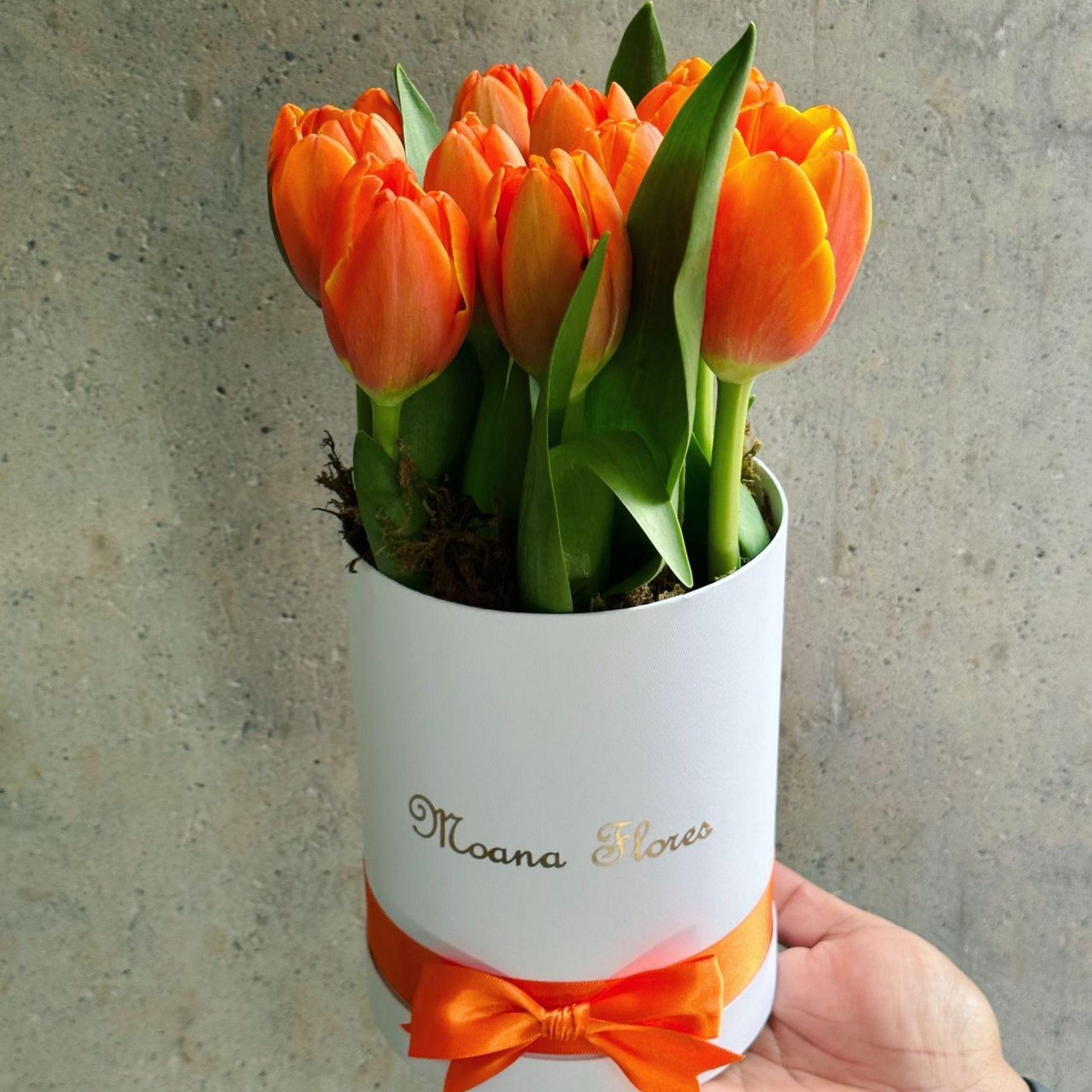 Este vibrante arreglo de tulipanes naranja, presentado en una caja alta blanca adornada con un listón naranja, aporta energía y frescura a cualquier espacio. Perfecto para sorprender con un detalle lleno de color y estilo, ideal para celebrar momentos especiales con un toque elegante y alegre.