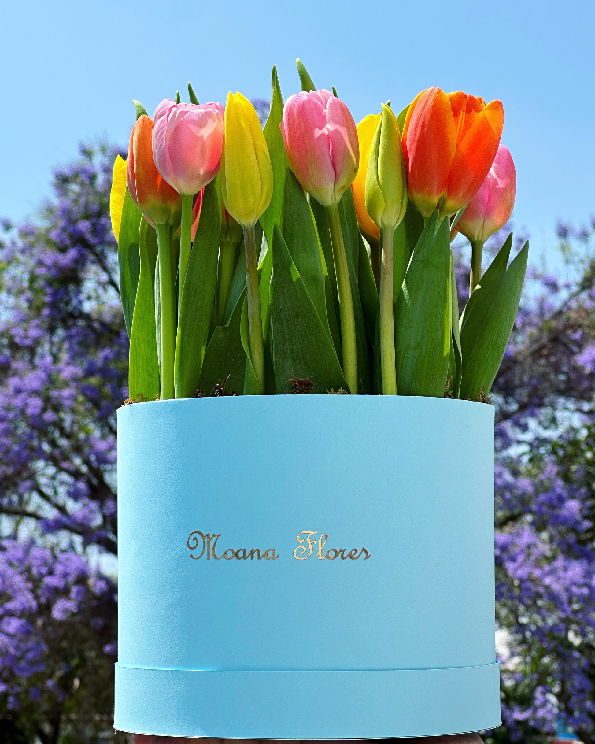Este vibrante arreglo combina tulipanes amarillos, naranjas y rosas, presentados en una elegante caja circular alta azul. Perfecto para transmitir alegría y frescura, este detalle floral aporta un toque colorido y sofisticado, ideal para sorprender en cualquier ocasión especial.