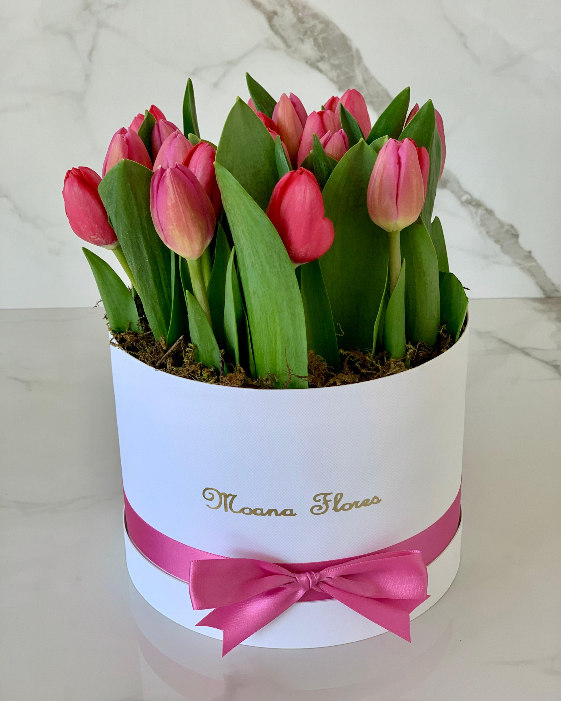 Este delicado arreglo de tulipanes rosas, presentado en una caja circular alta blanca adornada con un elegante listón, aporta un toque de ternura y sofisticación. Perfecto para sorprender y expresar sentimientos con estilo, este detalle floral es ideal para cualquier ocasión especial que requiera un regalo lleno de frescura y encanto.